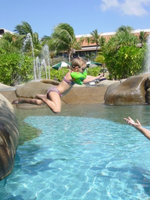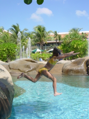 Jolijn springt van de rotsen in het zwembad