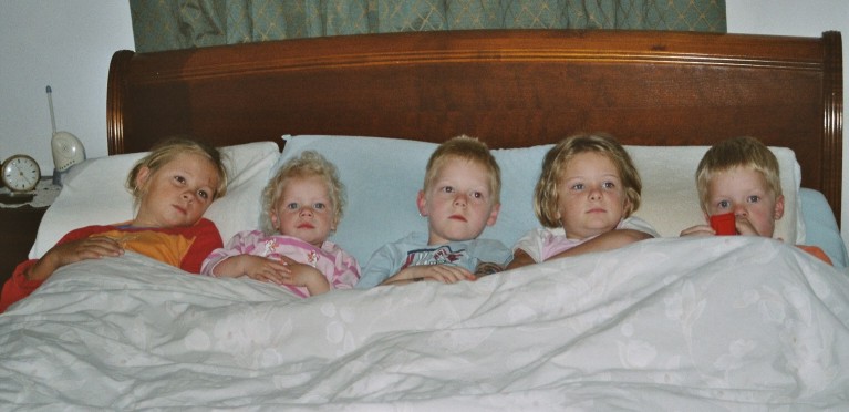 Jolijn, Neeltje, Teun, Meike en Daan liggen samen in bed