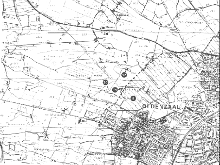 Ten opzichte van 1850 is Oldenzaal enorm gegroeid. De buitenwijken komen gevaarlijk dicht bij de geboortegrond van onze voorouders. Het gearceerde deel (rechts van de gestippelde lijn) is sinds kort door de gemeente Weerselo aan Oldenzaal afgestaan.