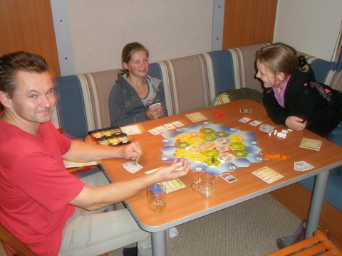 We ontdekken het spel De Kolonisten van Catan, dat maakt het heel gezellig tijdens de avonden in ons huurhuisje.