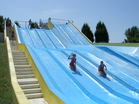 Jolijn en Meike op de mooie glijbanen van het zwemparadijs L'Archipel in Castres.