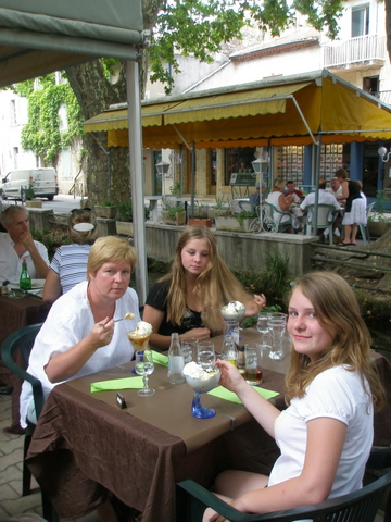 Pannenkoeken en ijs eten in het plaatsje Goudargues, op loopafstand van de camping in de Gard.