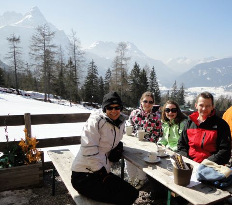 Philippa, Jolijn, Meike en Peter op het terras aan de Gamskar