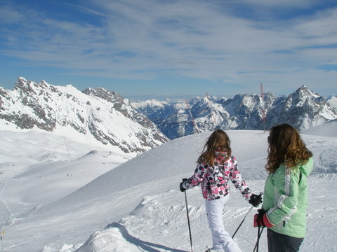 Jolijn en Meike op het Zugspitzplatt, het grote skigebied aan de Duitse kant van de Zugspitze.