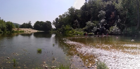 Dammen bouwen op de rivier bij de camping in Cornillon.