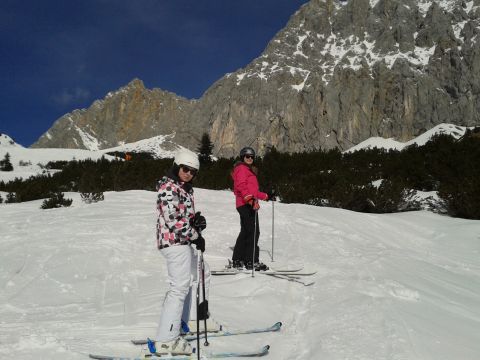Onze dames op de Gaistal-afdaling (achteraan op de Ehrwalder Alm), straks over een lekker rustige piste weer op weg naar de verwarmde stoeltjeslift. Dit jaar voor het eerst met helm, zoals bijna iedereen tegenwoordig ...