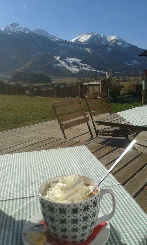 Judith geniet op een terrasje in de zon van een lekkere 'Choco mit Sahne'. Ook het uitzicht is geweldig, maar het lijkt wel zomer!