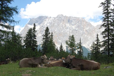 Koeien lopen vrij rond bij de Seebensee, met uitzicht op de Zugspitze.