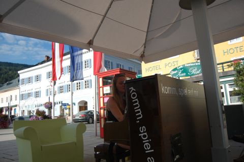 Op de markt in Radstadt, waar we op de terugweg door Oostenrijk nog een dagje extra bleven, staat een piano waarop iedereen mag spelen. Meike kan dat!