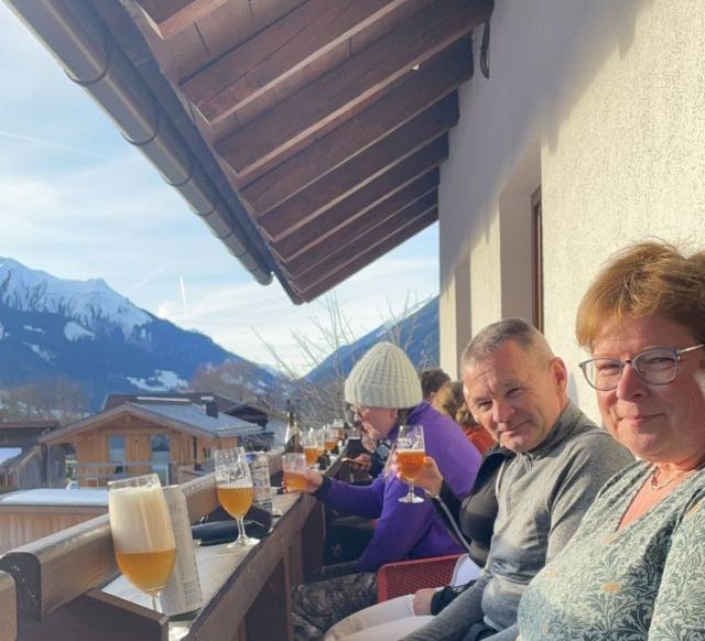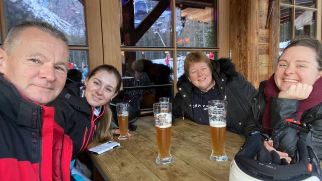 Aan het bier naast de piste, op het terras van de Brent Alm, onderaan de Ehrwalder Almlift.