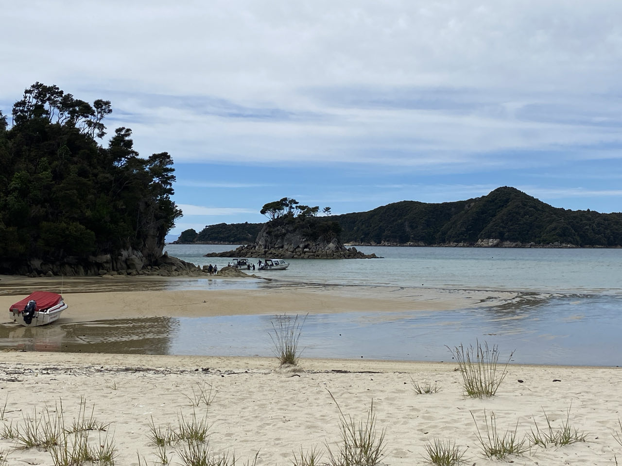 De watertaxi zal ons vandaag bij Torrent Bay afzetten, vanwaar we terug naar huis zullen lopen. Bij het watertaxibedrijf stappen we in een boot op een trailer met een trekker ervoor. Beetje ridicuul gezicht, al die boten met mensen op de rijweg. Maar het is eb, de trekker rijdt wel 150 meter het strand op voordat er voldoende water is. De taxi moet ook elders mensen ophalen, dus pikken we als extraatje een bezienswaardigheid mee: Split Apple Rock. De granieten rots lijkt inderdaad op twee appelhelften.