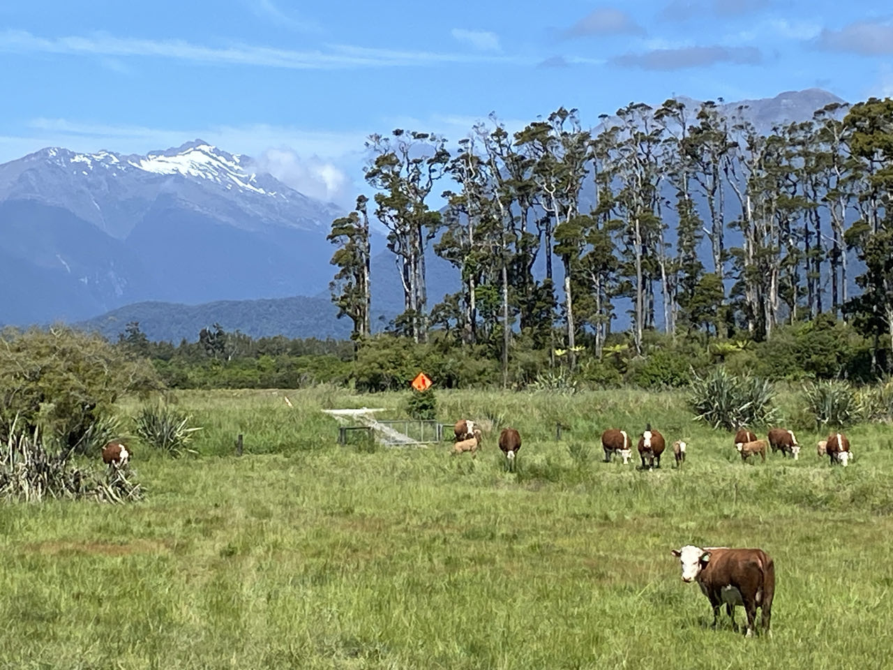 Als we vertrekken uit Franz Josef zien we een bordje: tankstation over 120 kilometer. En dat is precies de plaats waar we uit willen komen, in Haast. Over de enige weg die door het hele gebied loopt. Maar eerst wagen we een laatste poging om iets van een gletsjer te zien. In de plaats Fox Glacier rijden we naar een uitzichtpunt en verhip, een stukje van de gelijknamige gletsjer is zichtbaar. De bovenkant is ook hier in de wolken gehuld.