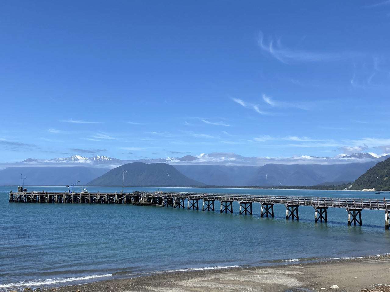 In Haast bezoekt Peter het bezoekerscentrum. Hij vraagt naar leuke wandelingen en de beste plaats om te lunchen. Dat restaurantje ligt 40 kilometer verderop in Jackson Bay. Dus rijden we naar deze oranje en paarse 'wagon'. Voor het eten hoef je niet naar Nieuw-Zeeland maar in de Cray Pot weten ze hoe je vis en super lekkere seafood chowder (soort vissoep) klaar maakt. En dat in een mooie baai met pier en bergen met sneeuw op de toppen in de achtergrond. In de zon zitten we te genieten van het uitzicht.