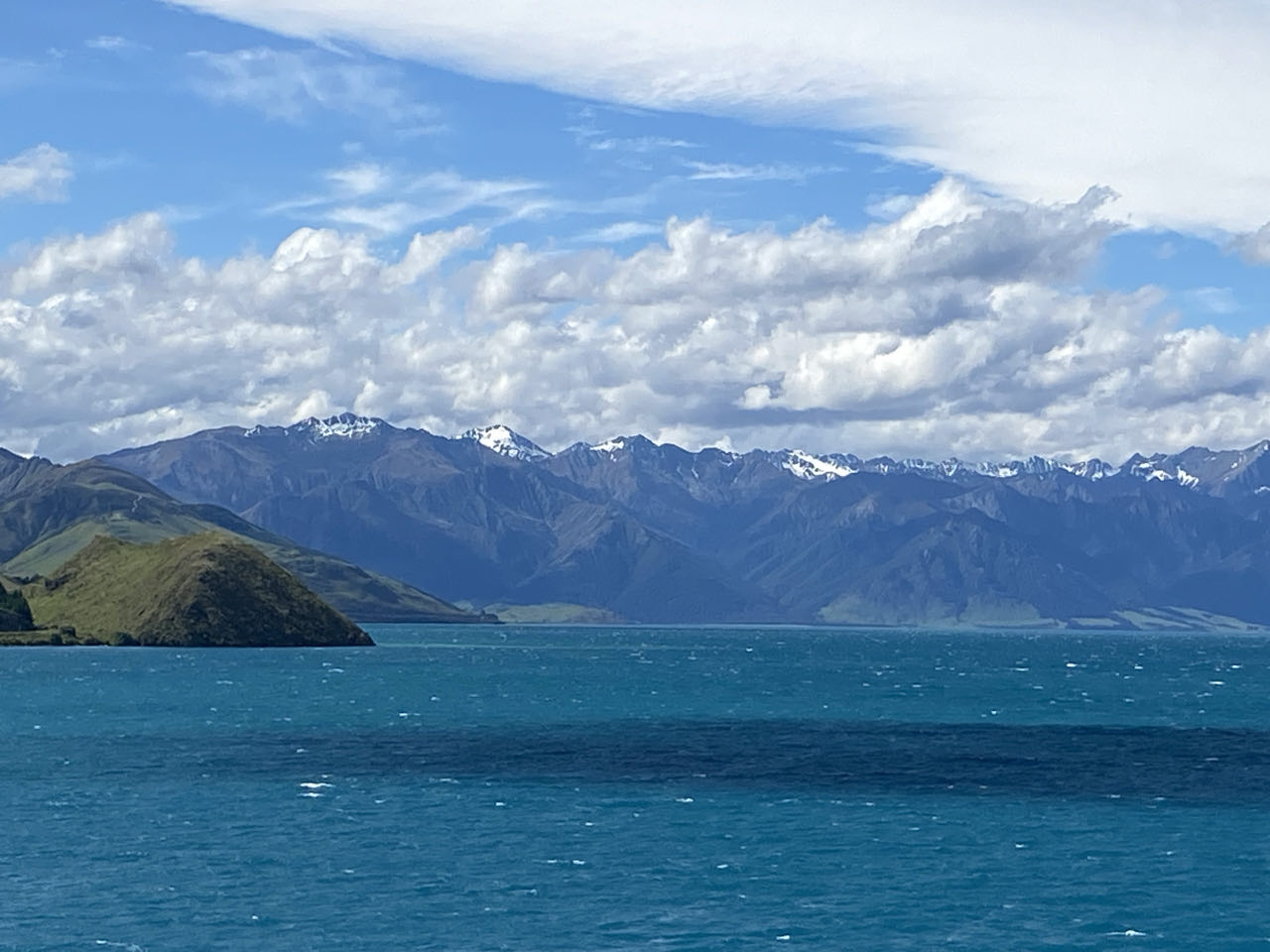 De route leidt ons verder langs Lake Wanaka, erg mooi, daarna maken we een bochtje en rijden recht af op Lake Hawea. Prachtig!