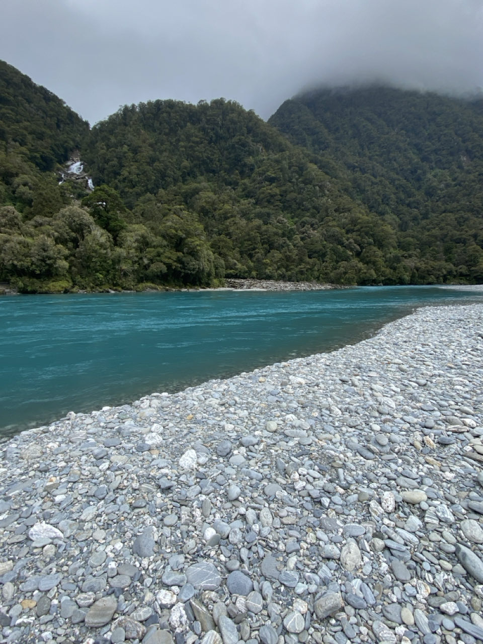 Peter rijdt ons in onze witte Toyota Corolla naar Lake Hawea waar we twee nachten zullen doorbrengen. Highway 6 is zo’n beetje de enige weg in dit gebied en we rijden dus 122 km op deze weg, tot het punt dat we afslaan op de plaats van bestemming. Onderweg stoppen we achtereenvolgens voor een wandeling naar waterval Roaring Billy. Mooier vinden we nog de brede rivierbedding bezaaid met de fraaiste kiezels en rivierwater van het mooiste blauw.