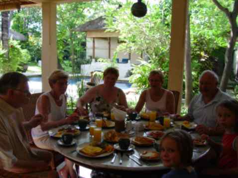Tijdens het bezoek van Jo, Tini, Lambert en Ardie zijn we ook nog een kleine week op vakantie gegaan in Bali (Indonesie). Deze bestemming was ons eerder (zie Bali) ook al heel goed bevallen. Omdat we deze keer met een grotere groep waren, hebben we een luxe huisje gehuurd (zie Bali Melita Villa) in Sanur. Uiteraard hebben we op Bali de tempels, rijstvelden en vulkaan bezocht. De dames hebben veel tijd gestoken in het winkelen (inclusief het noodzakelijke afdingen), maar de kinderen vonden het zwembad en Waterbom Park veel leuker.