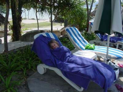 Meike in de ligstoel bij het zwembad