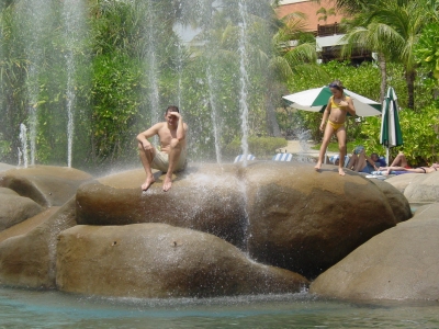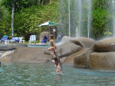 Peter en Jolijn onder de fonteinen in het zwembad
