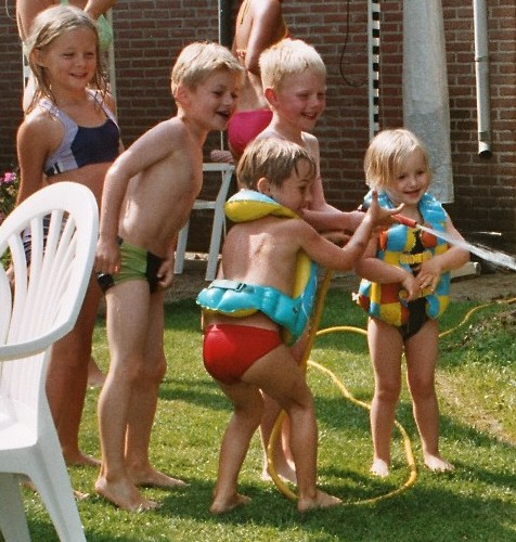 Jolijn, Chiel, Robin, Teun en Sanne spelen met water