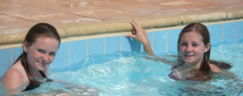 Meike en Jolijn in het zwembad van camping "Les Amarines", erg goed verzorgd en mooi opgezet.