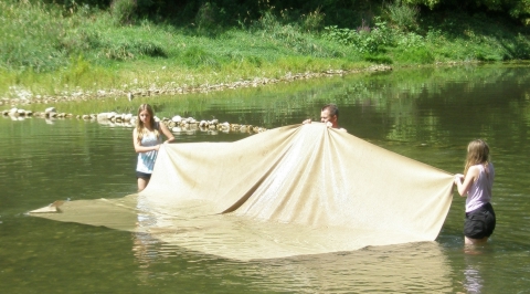 Na een onweersbui in de nacht wassen we het grondtapijt in de rivier waar de camping aan ligt.