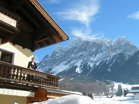 Judith kijkt ons na vanaf het balkon van het appartement, met op de achtergrond de Zugspitze.