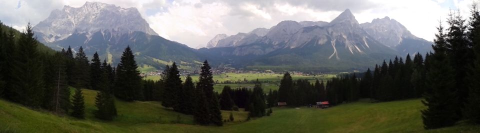Panorama over Ehrwald met de Zugspitze en Sonnenspitze als hoogste bergen daar omheen.