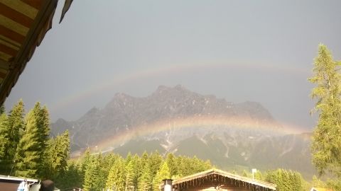 Na een flinke hoosbui op de camping in Ehrwald brak de zon weer snel door, met een dubbele regenboog voor de Zugspitze als resultaat.