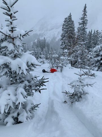 Same of Abel is gevallen in de diepe verse sneeuw tussen de bomen.