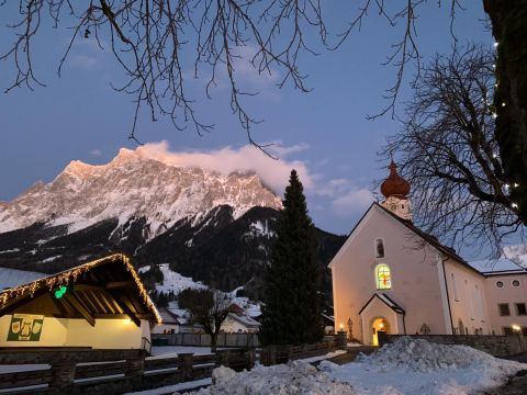 Het kerkje van Ehrwald aan het einde van de dag, met de Zugspitze op de achtergrond.