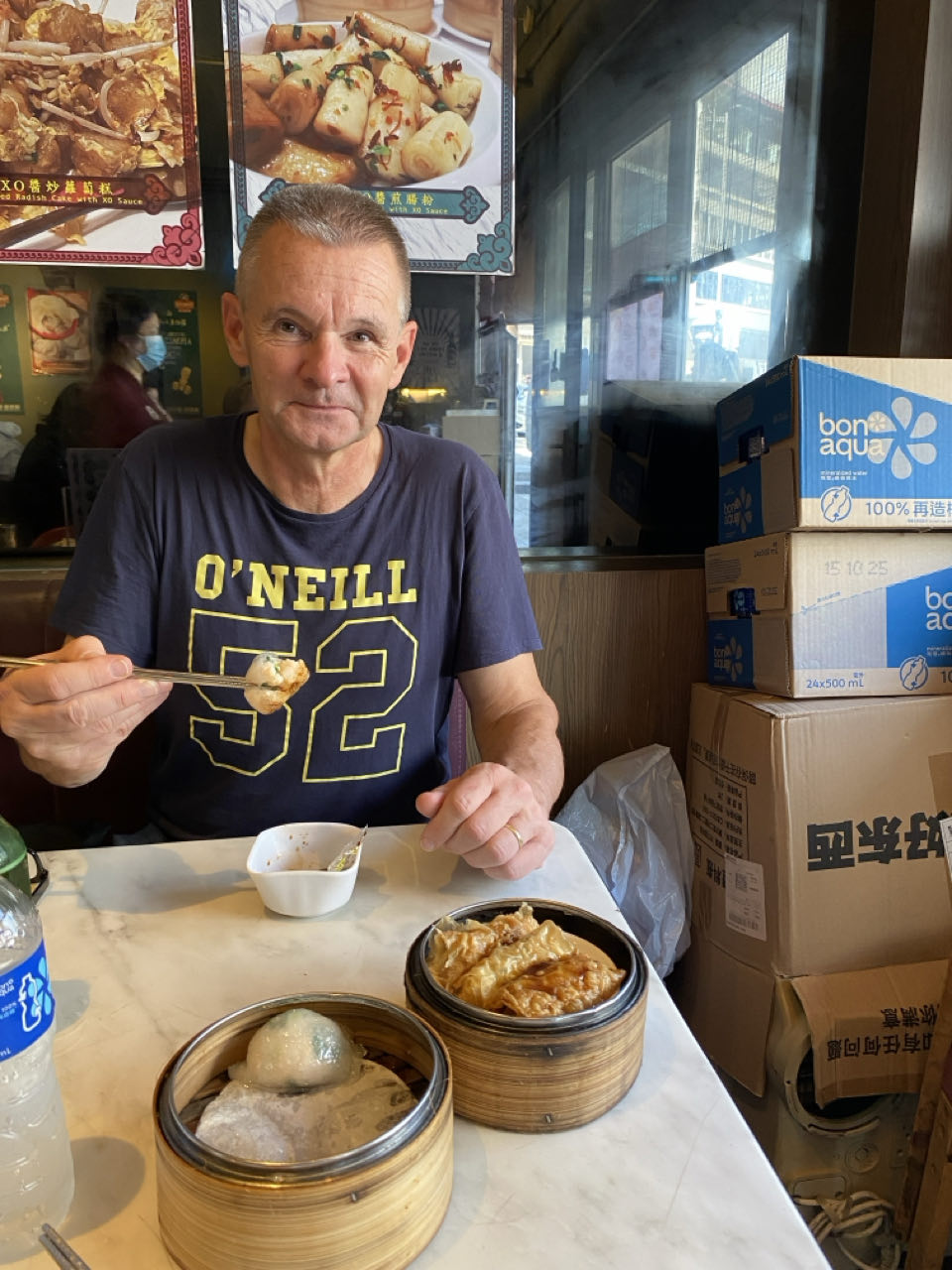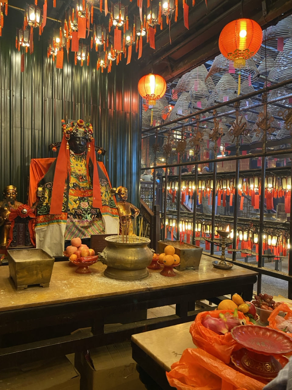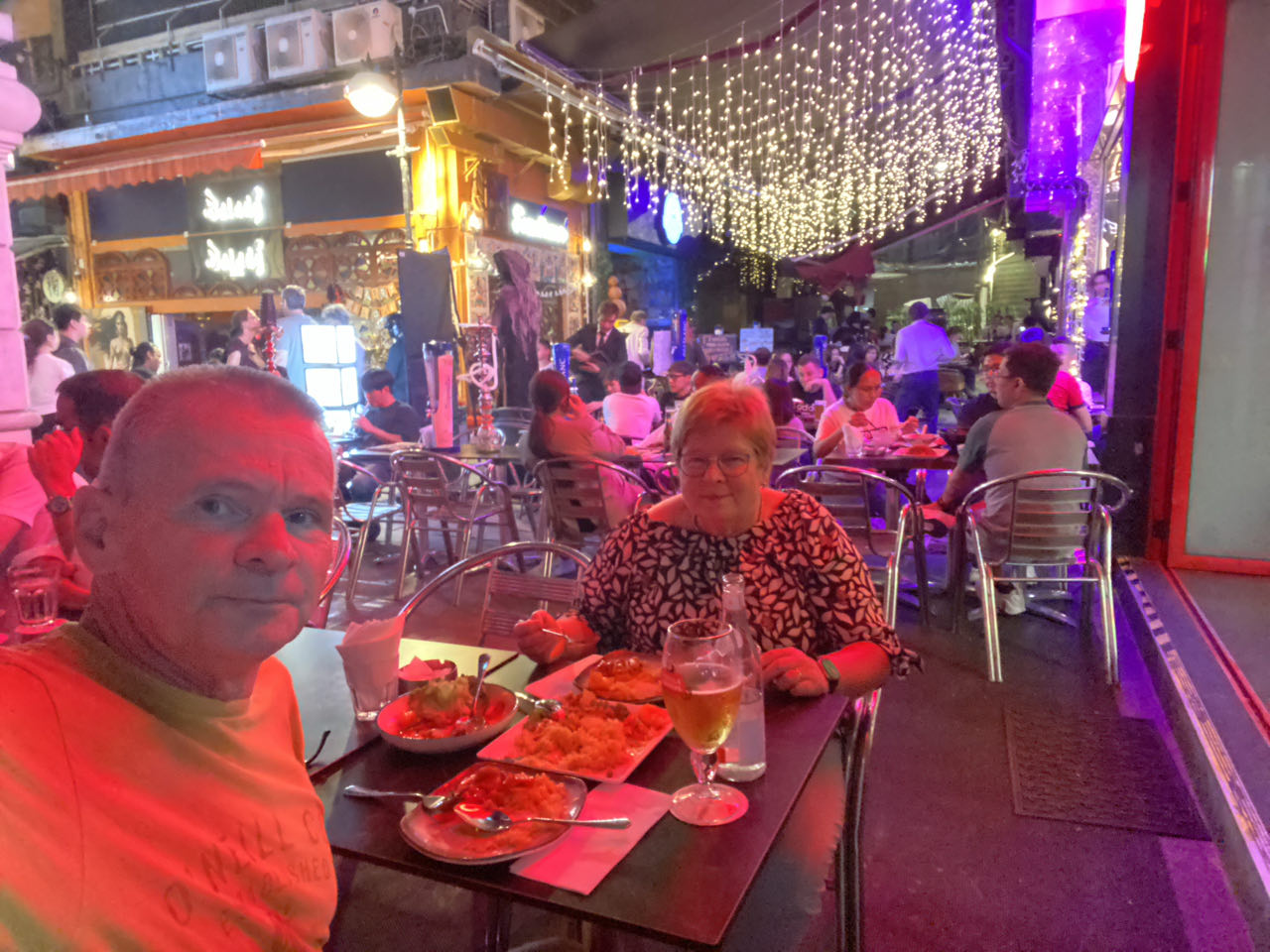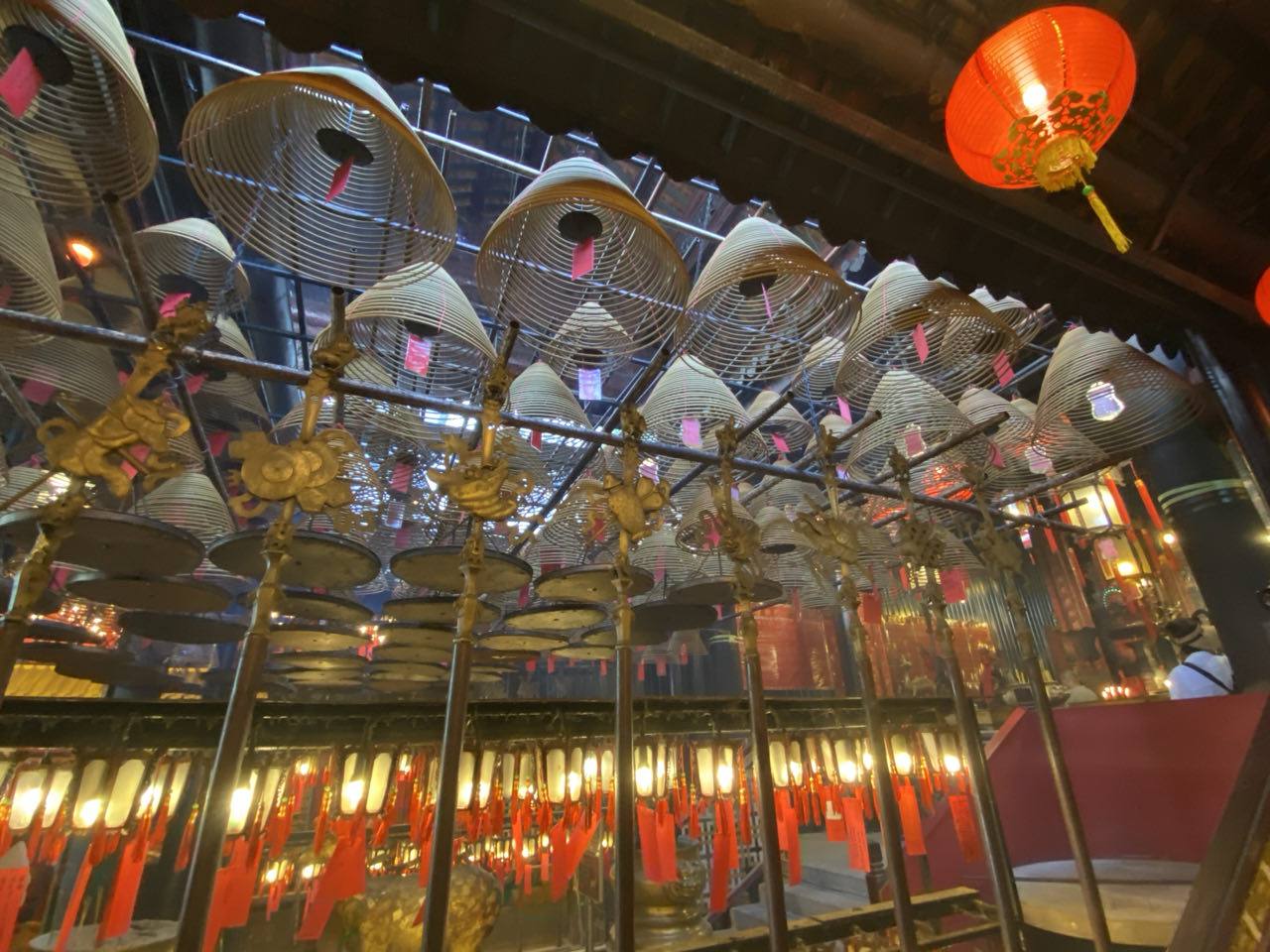 Na een voorspoedige vliegreis, waarin ik helaas nauwelijks sliep, landden we om 07.00 uur in Hong Kong. Vanaf het hotel liepen we eerst naar the Center, het gebouw waar Peter vier jaar lang op de 59e verdieping werkte. 's Middags aten we Dim Sum in een restaurant dat zo weinig ruimte had dat we pal naast de opslag water en bier zaten. We bezochten daarna de Mo Man tempel. De grote wierookspiralen brandden allemaal, dus daarna stonken we wel naar wierook. Na een douche in het hotel gingen we met het trammetje en de Peak Tram naar Victoria Peak. Vanaf daar heb je een geweldig uitzicht over Hong Kong. Hier liepen we ook een wandelroute rondom de Peak zodat je zicht hebt op Hong Kong Island in alle windrichtingen. We bleven er totdat het donker was geworden en reden met de bus terug waar we in uitgaansgebied Lan Kwai Fong Thais in de buitenlucht aten. Heerlijk op zo'n zwoele herfstavond, het was nog altijd 28 graden. En daarna naar bed. Na 31 uur wakker blijven met 2 keer vijf minuten slaap waren we daar wel aan toe.
