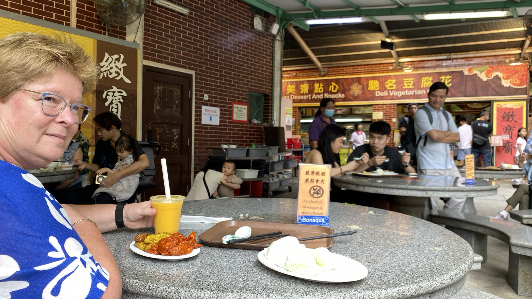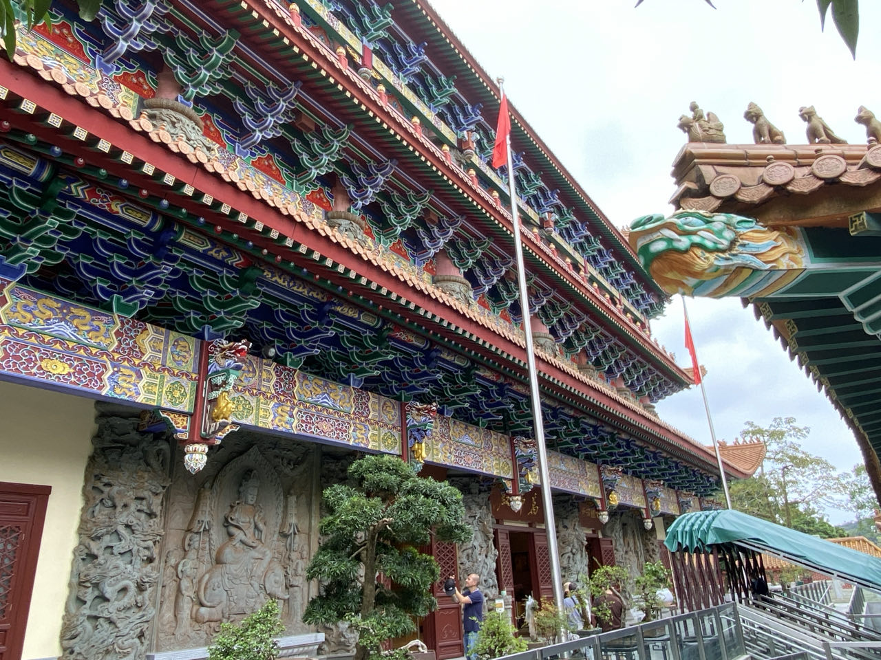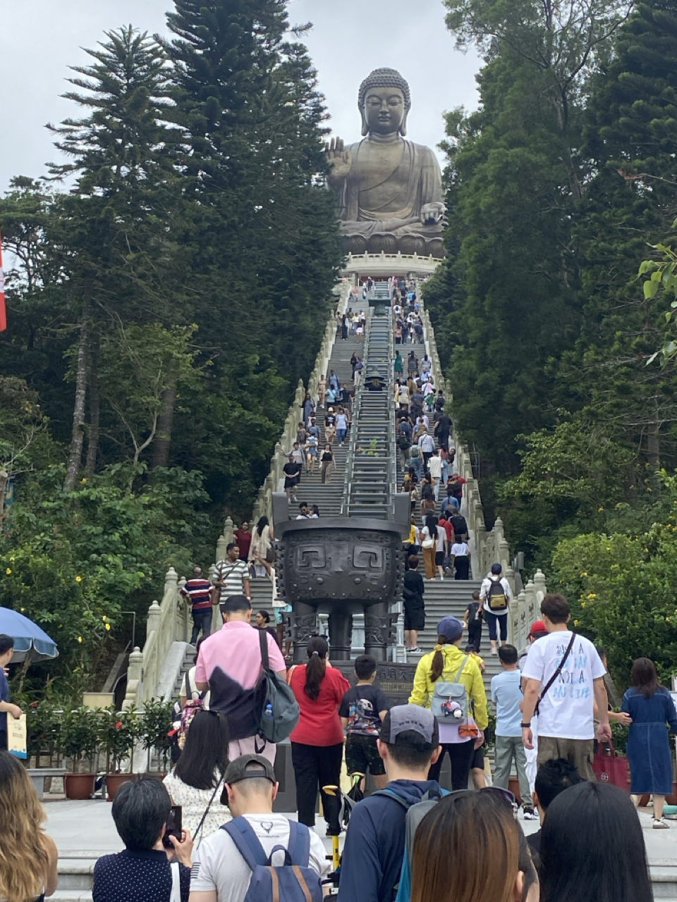 Meer mensen hebben bedacht de 6 km lange cable car rit te maken. Er staat een rij van ruim 300 meter. Dus pakken we de bus. Pakken we wel 'een extra eitjeslift' op wintersport. Bij de Big Buddha lopen we ook even naar het boeddhistische klooster en nemen we wat te eten bij het vegetarische café. Maar we vinden het echt niet lekker, wel goed voor de lijn. De bordjes gaan bijna vol terug.