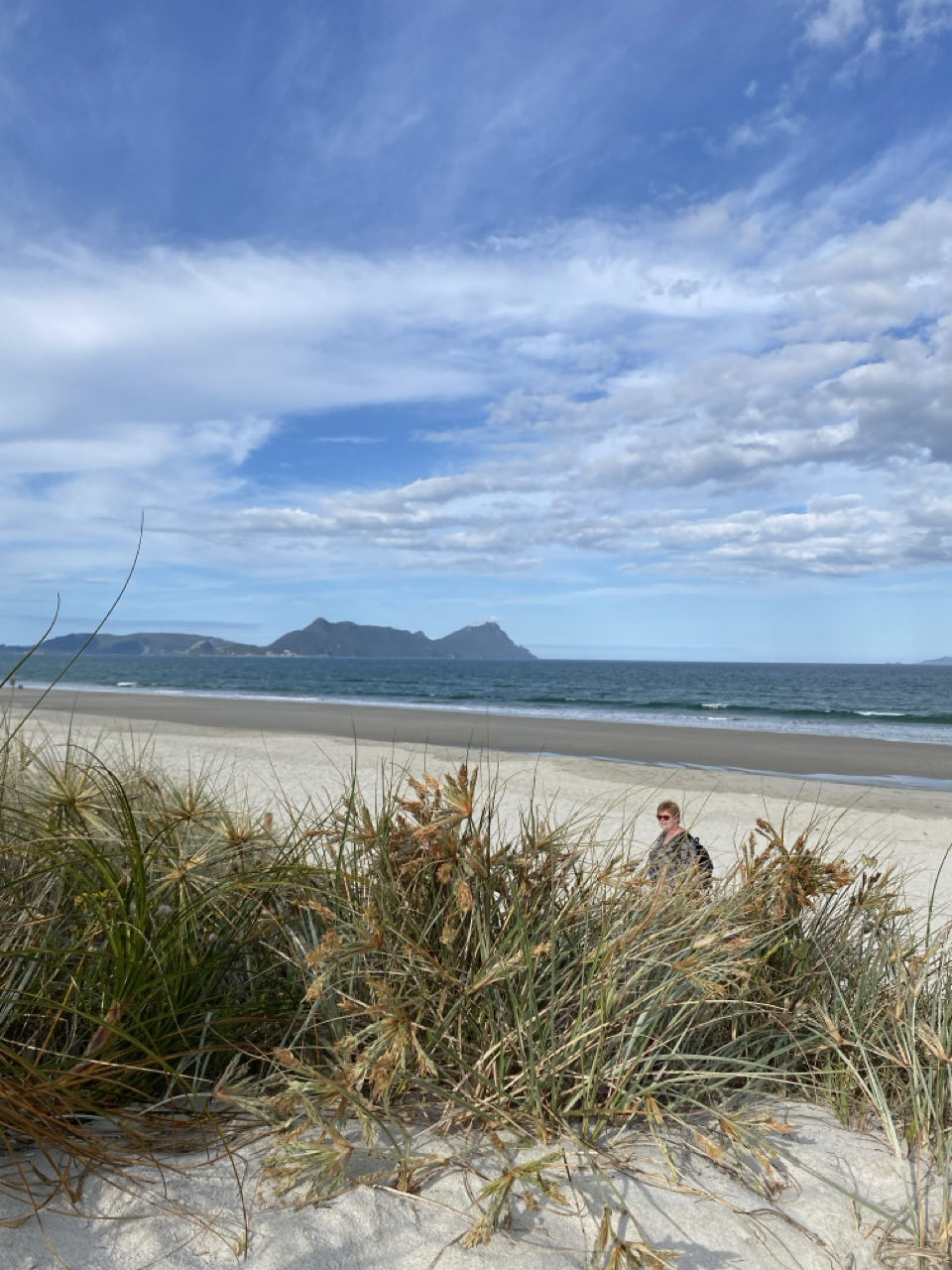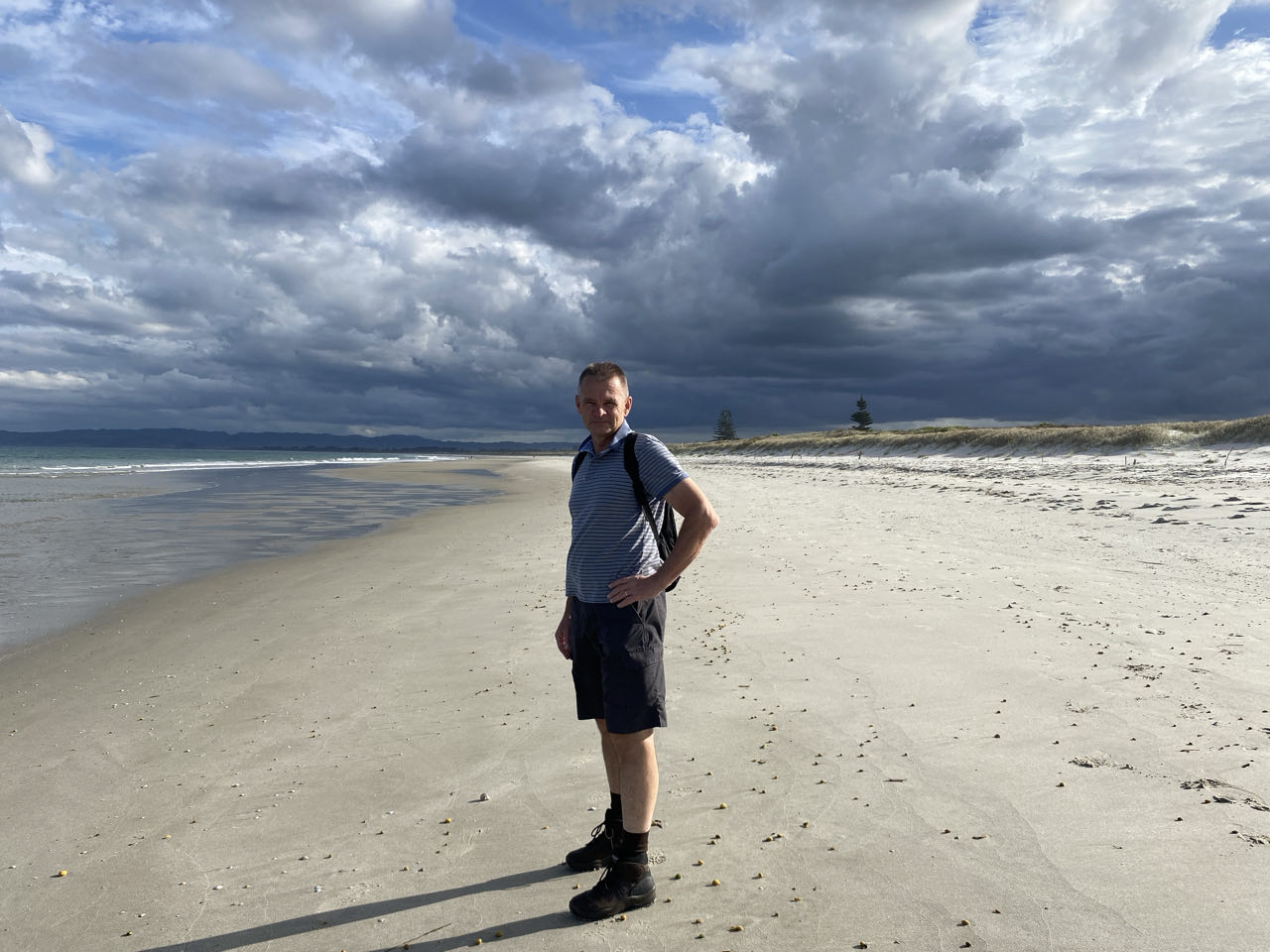 We rijden in de vroege avond een paar kilometer verderop naar het strand om daar te wandelen. De wolken zijn dreigend maar regenen gaat het niet.