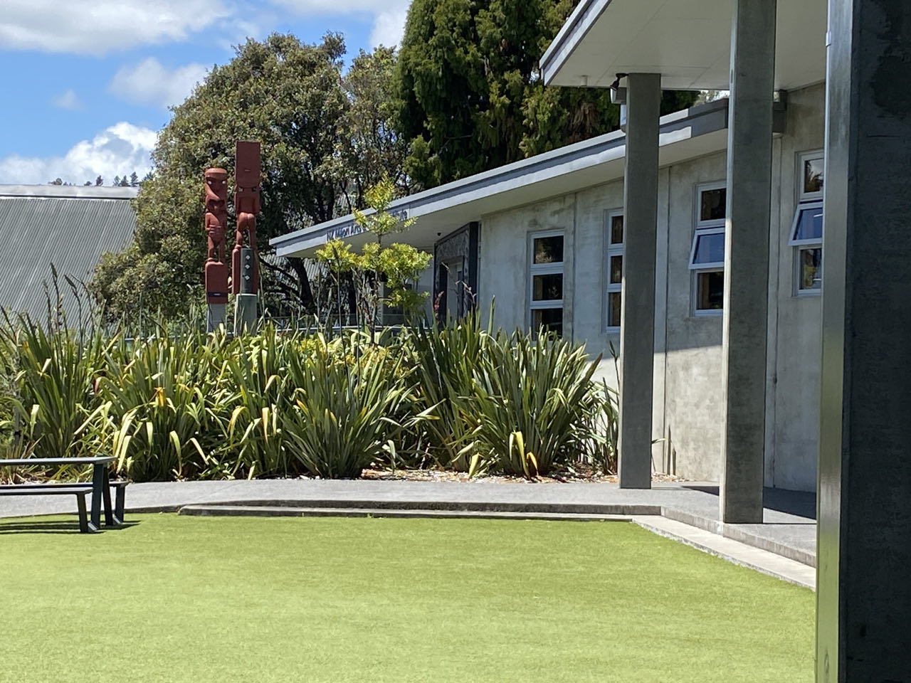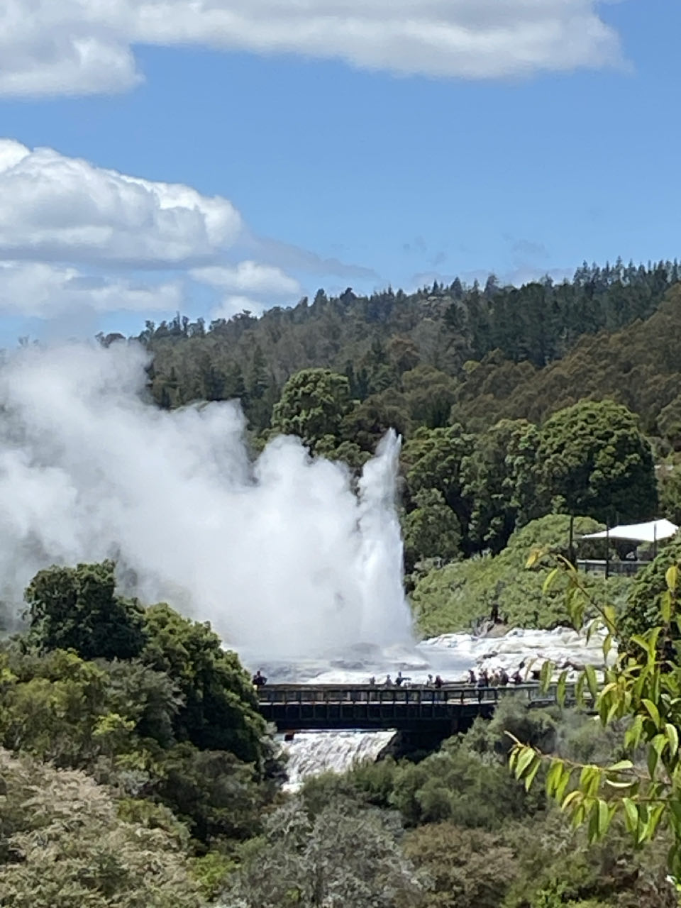 Ook vandaag stappen we in de auto. We rijden door een soort Teletubbie-landschap. Heuvels begroeid met gras, soms met grazende koeien, soms met schapen. In Roturoa zou een parkje zijn met modderbaden en warm water meertjes. Maar dat blijkt niet veel te zijn. Er is wel een Farmers Market maar die bestaat voornamelijk uit auto's en stalletjes van waaruit eten wordt verkocht. Na onze Thaise lunch rijden we snel door naar het Te Puia park met een Arts and Crafts centrum in een geothermaal gebied. Dit centrum is eigenlijk een school waar traditionele houtbewerking en weeftechnieken van de Maori worden onderwezen. Die dreigden te verdwijnen. Verder wordt er geleerd om sieraden te maken van klei, walvisbot en jade.