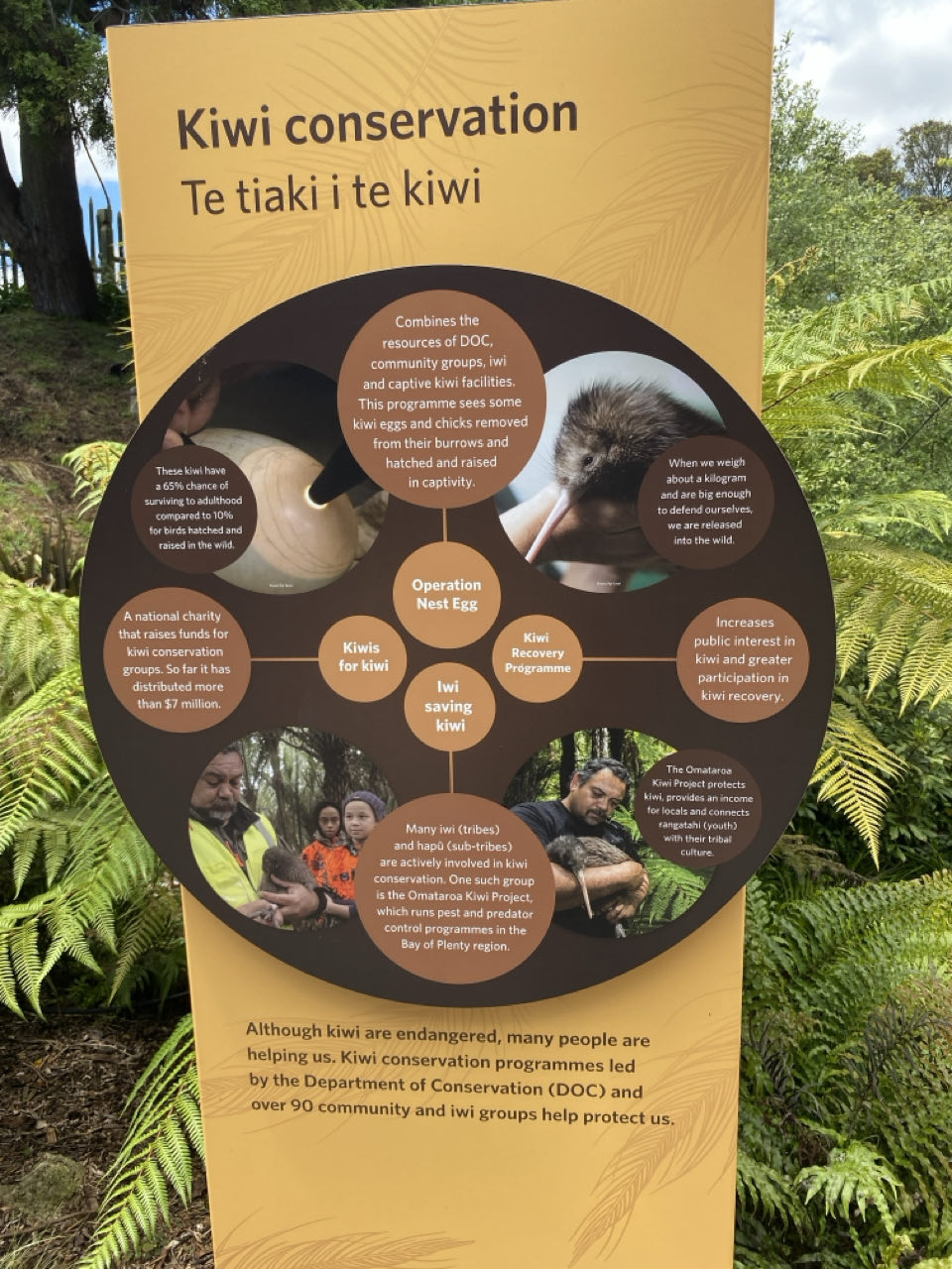 Verder is er een gebouw waar ze bezig zijn met de kiwi, nationaal icoon van Nieuw-Zeeland. Vroeger waren er miljoenen van deze vogels, maar geïntroduceerde beesten als hermelijnen, fretten en dergelijke bedreigen het voortbestaan van de vogels, die slecht zien, niet kunnen vliegen en hun nesten op de grond bouwen. In een ruimte hebben ze het dag en nacht-ritme verwisseld waardoor we de kiwi, die 's nachts actief is, kunnen zien rondscharrelen. Het is een koddig beest met die volleybal als buik en een klein koppie en die hele lange snavel. Hopelijk weten ze de teruggang van de soort te stoppen.