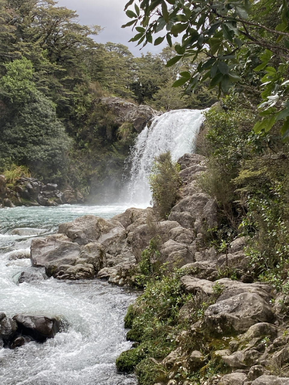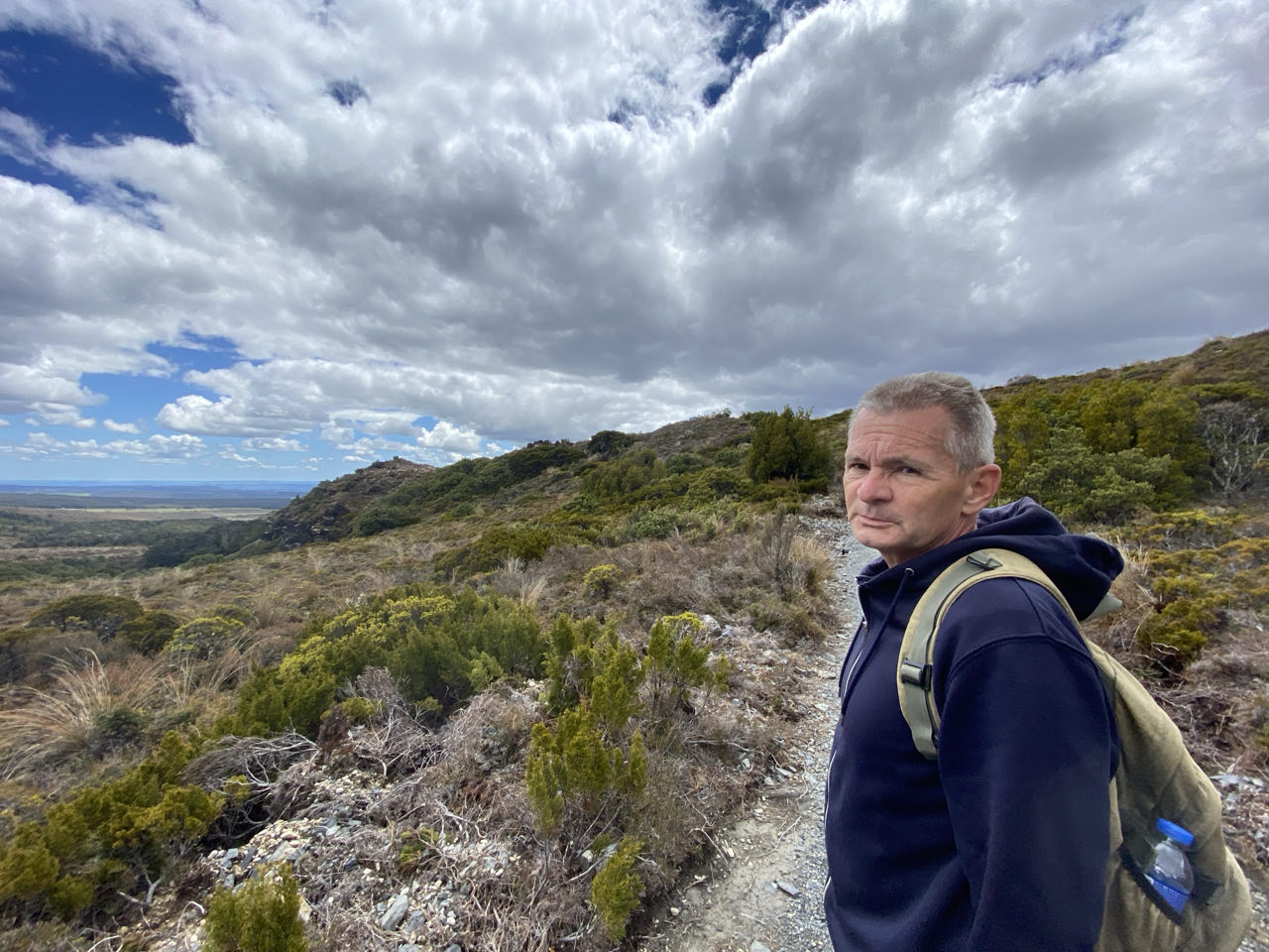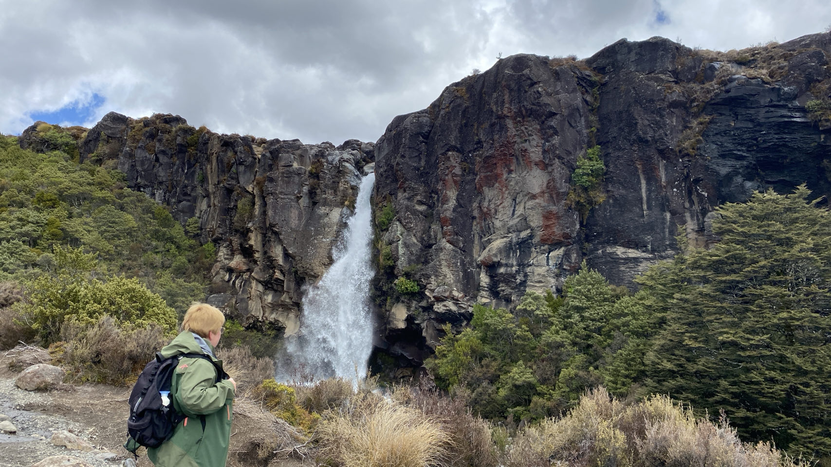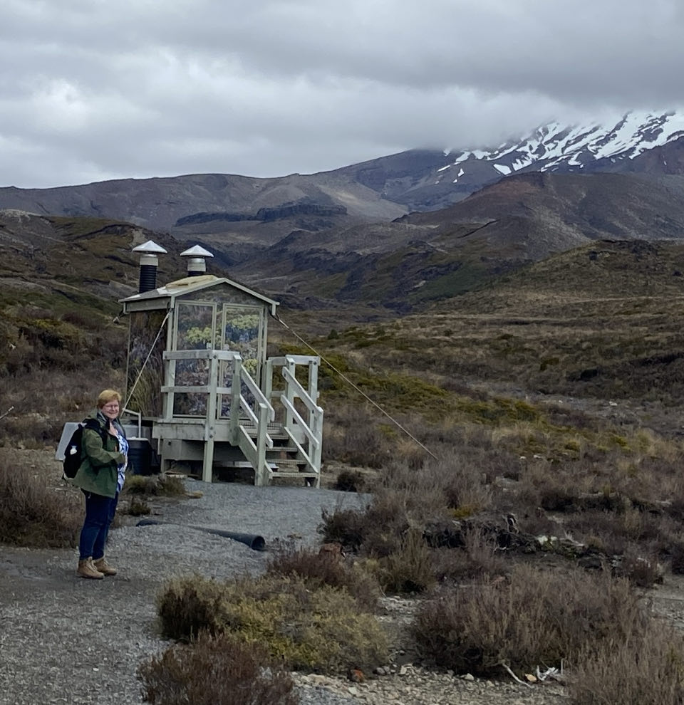 Er is daar een hele mooie wandeltocht, die leidt langs kratermeren en een actieve vulkaan. Maar 20 kilometer lopen, ondertussen 800 meter stijgen en steile afdalingen in rul zand en over keien is iets teveel van het goede voor mij en anders wel voor mijn linkerknie. Zeker bij slecht weer. Waar wij liepen was het weer prima, maar we zagen dat het bij de vulkaan mistig werd in de middag. Elk jaar worden de meeste reddingsacties in Nieuw-Zeeland uitgevoerd op die tocht. Gelukkig zijn er meer wandeltochten dus liepen we die naar de Taranaki-waterval via diverse landschappen. Ook fijn, er is halverwege in de buurt van de waterval een toiletgebouwtje. In een hokje staat een toiletpot boven een gat in de grond. Aan toiletpapier en water doen ze niet dus is het een kwestie van met toenemende opluchting erboven hangen en je ding doen.