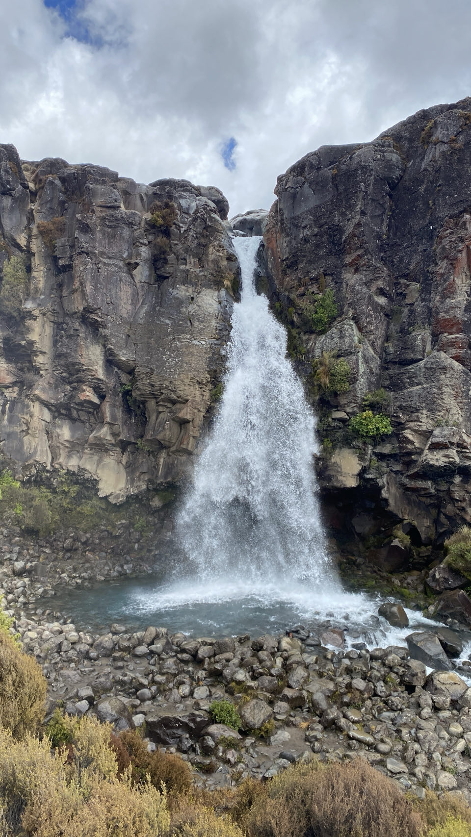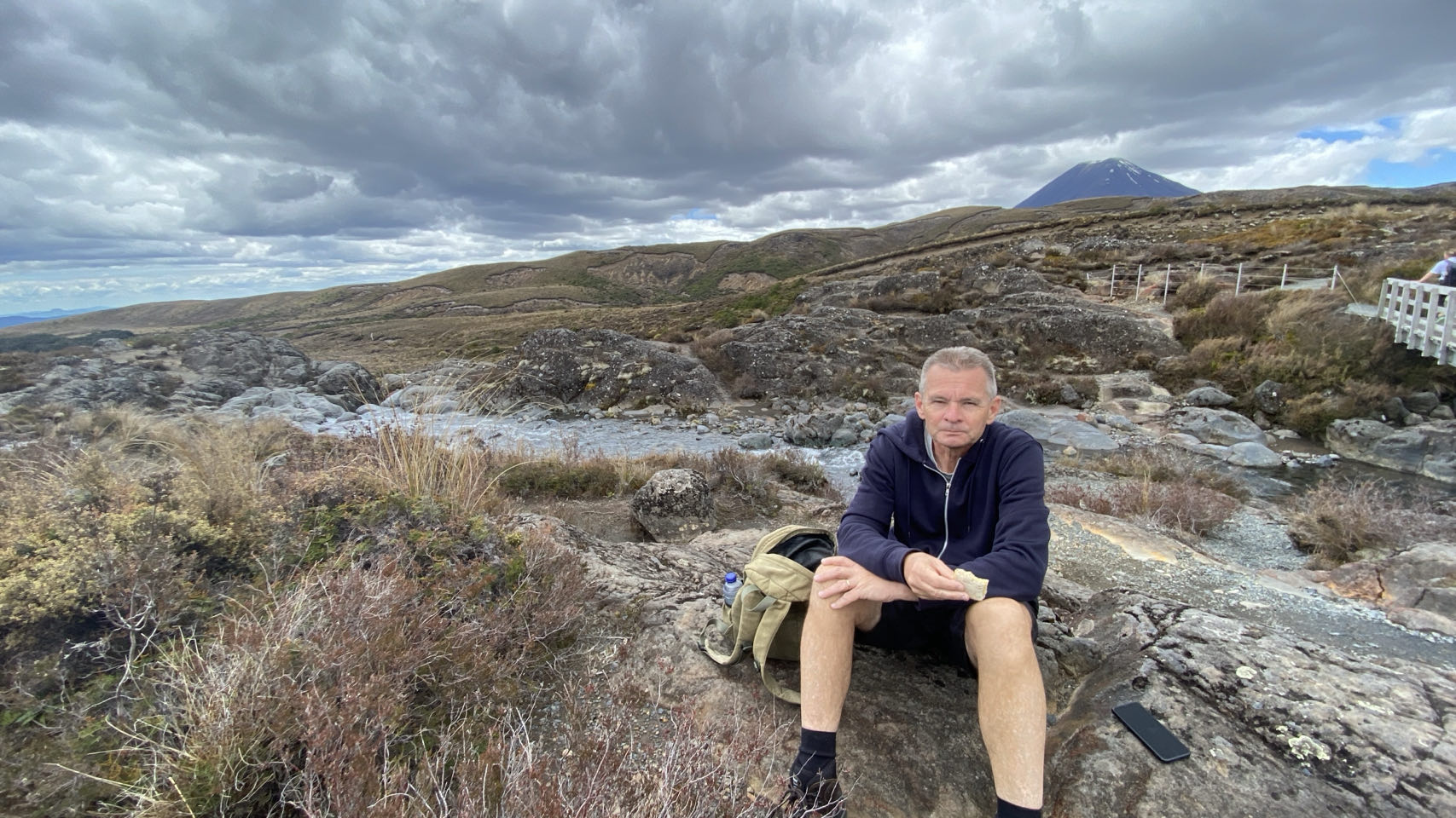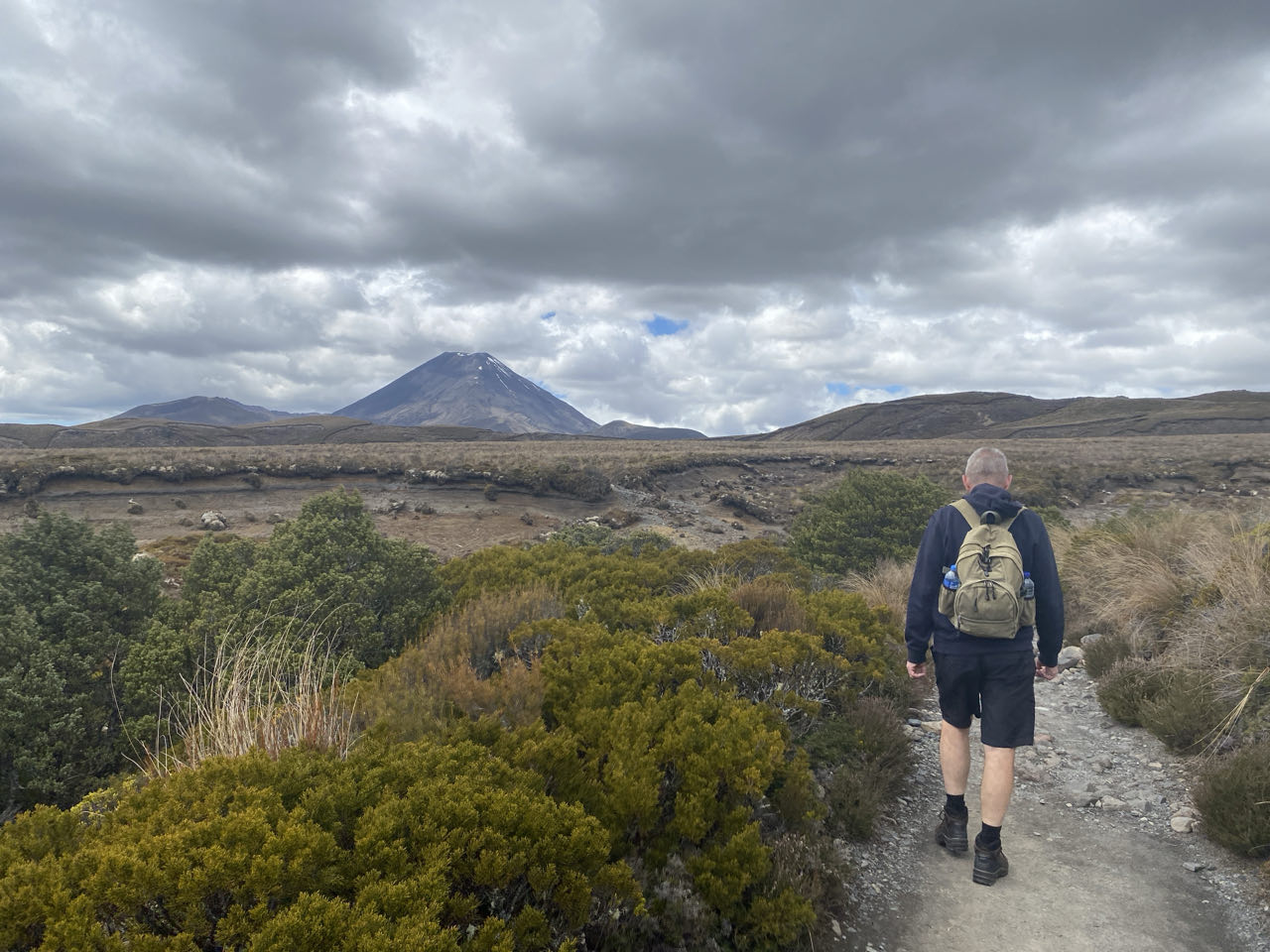 Er is daar een hele mooie wandeltocht, die leidt langs kratermeren en een actieve vulkaan. Maar 20 kilometer lopen, ondertussen 800 meter stijgen en steile afdalingen in rul zand en over keien is iets teveel van het goede voor mij en anders wel voor mijn linkerknie. Zeker bij slecht weer. Waar wij liepen was het weer prima, maar we zagen dat het bij de vulkaan mistig werd in de middag. Elk jaar worden de meeste reddingsacties in Nieuw-Zeeland uitgevoerd op die tocht. Gelukkig zijn er meer wandeltochten dus liepen we die naar de Taranaki-waterval via diverse landschappen. Ook fijn, er is halverwege in de buurt van de waterval een toiletgebouwtje. In een hokje staat een toiletpot boven een gat in de grond. Aan toiletpapier en water doen ze niet dus is het een kwestie van met toenemende opluchting erboven hangen en je ding doen.