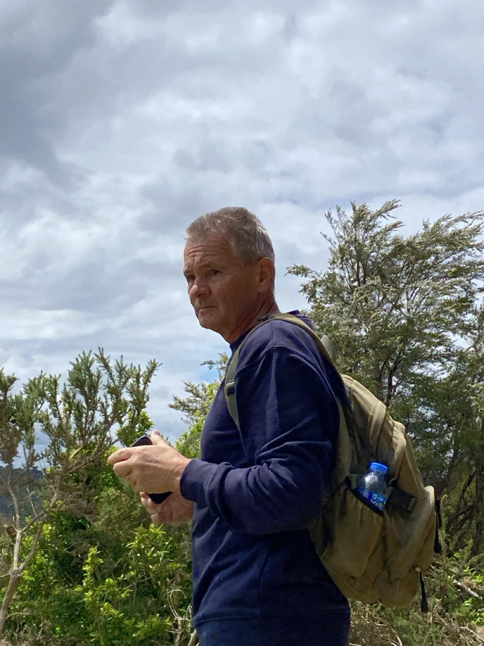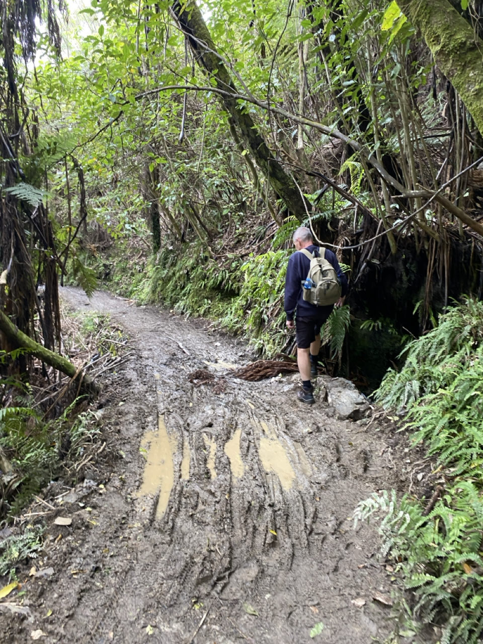In Mistletoe Bay beginnen we aan onze wandeling van 13 kilometer. Er staat vier uur voor vanwege de klimmetjes en afdalingen, soms door de modder, vaak over ongelijke keien. We genieten van het uitzicht, helemaal als de zon door het wolkendek tevoorschijn piept. De wilde geiten en varkens, waarover Shayne vertelde, verstoppen zich voor ons, we zien ze in ieder geval niet. Maar de vogels fluiten wel volop. En op allerlei plekken zien we watervalletjes naar beneden stromen.