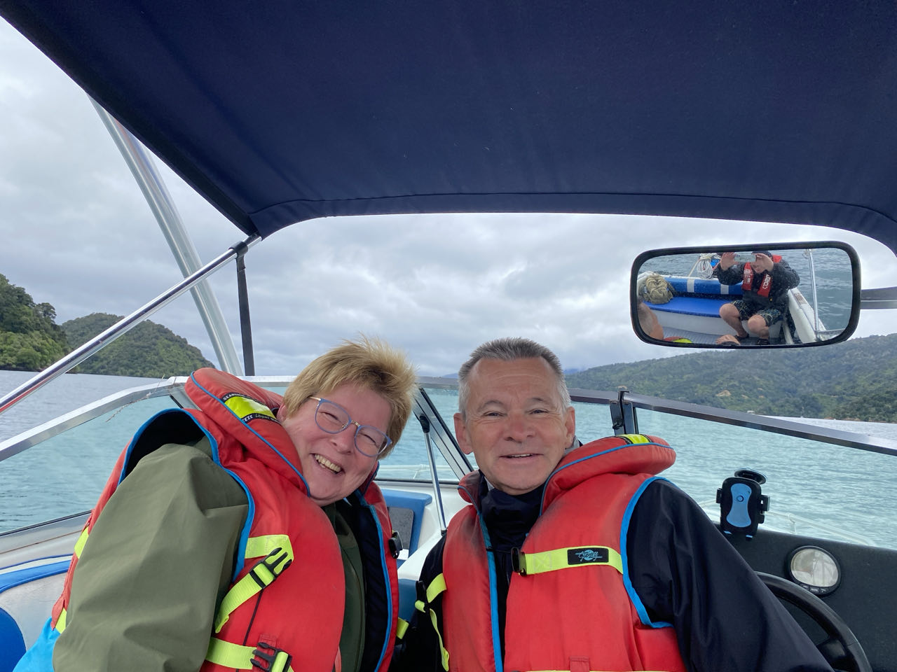 Shayne, de eigenaar van het appartement, brengt ons met de boot naar Mistletoe Bay. Onderweg vertelt hij over orca's, zeehonden en dolfijnen die af en toe in de baai zwemmen. Hij laat ons ook foto's zien van hem met dolfijnen naast hem. Dat geluk hebben wij vandaag niet.