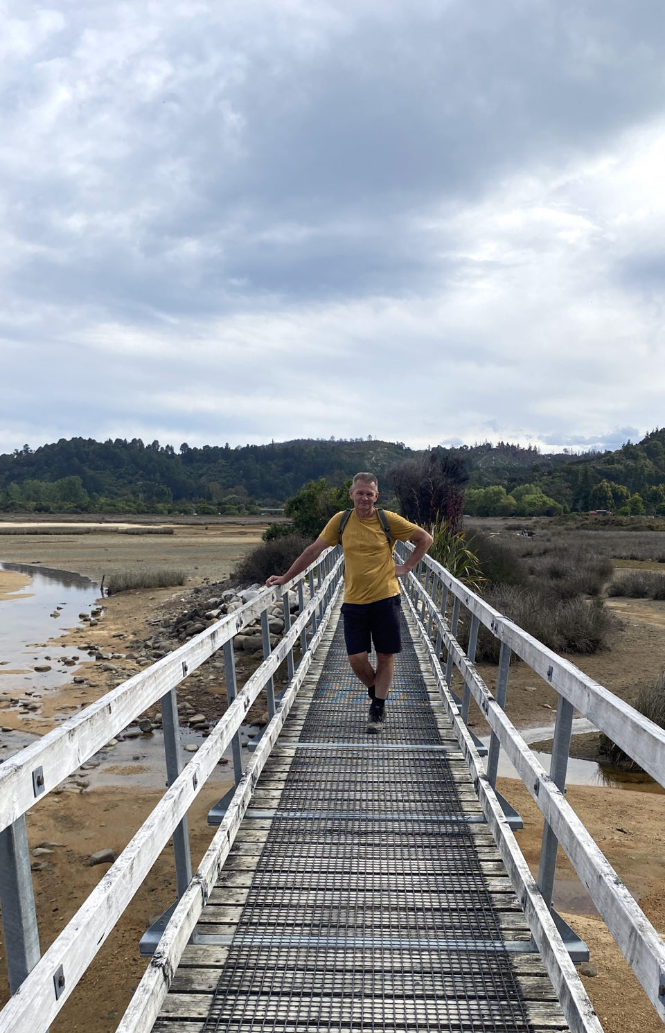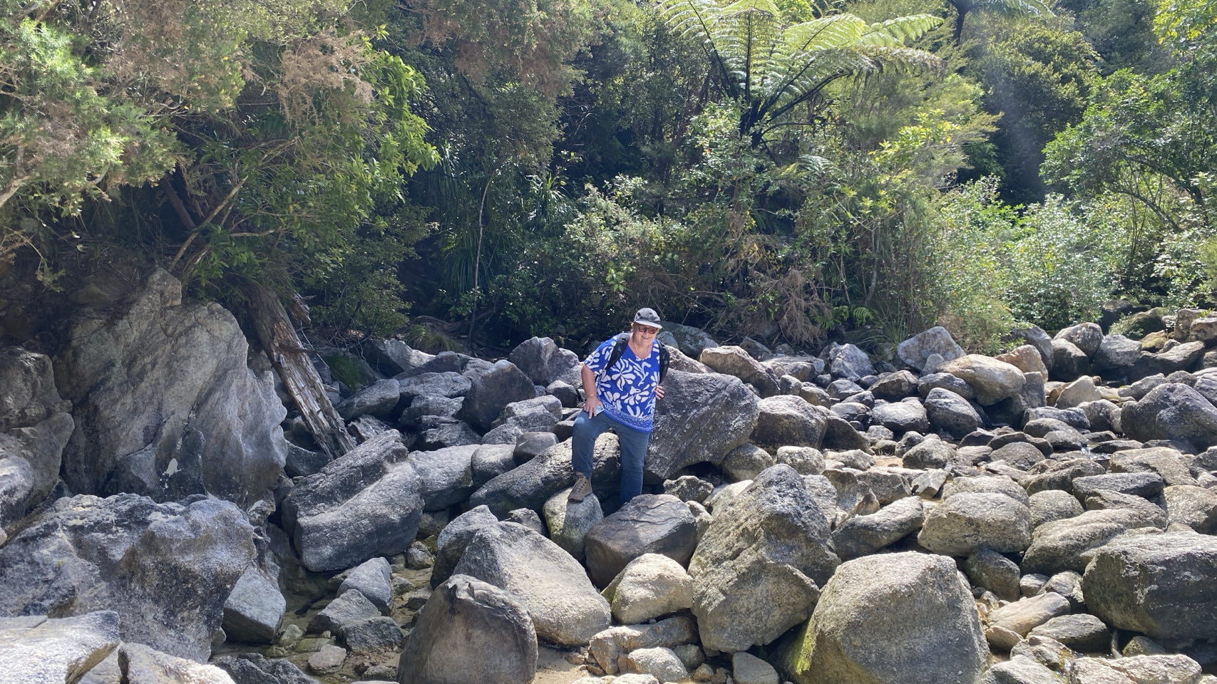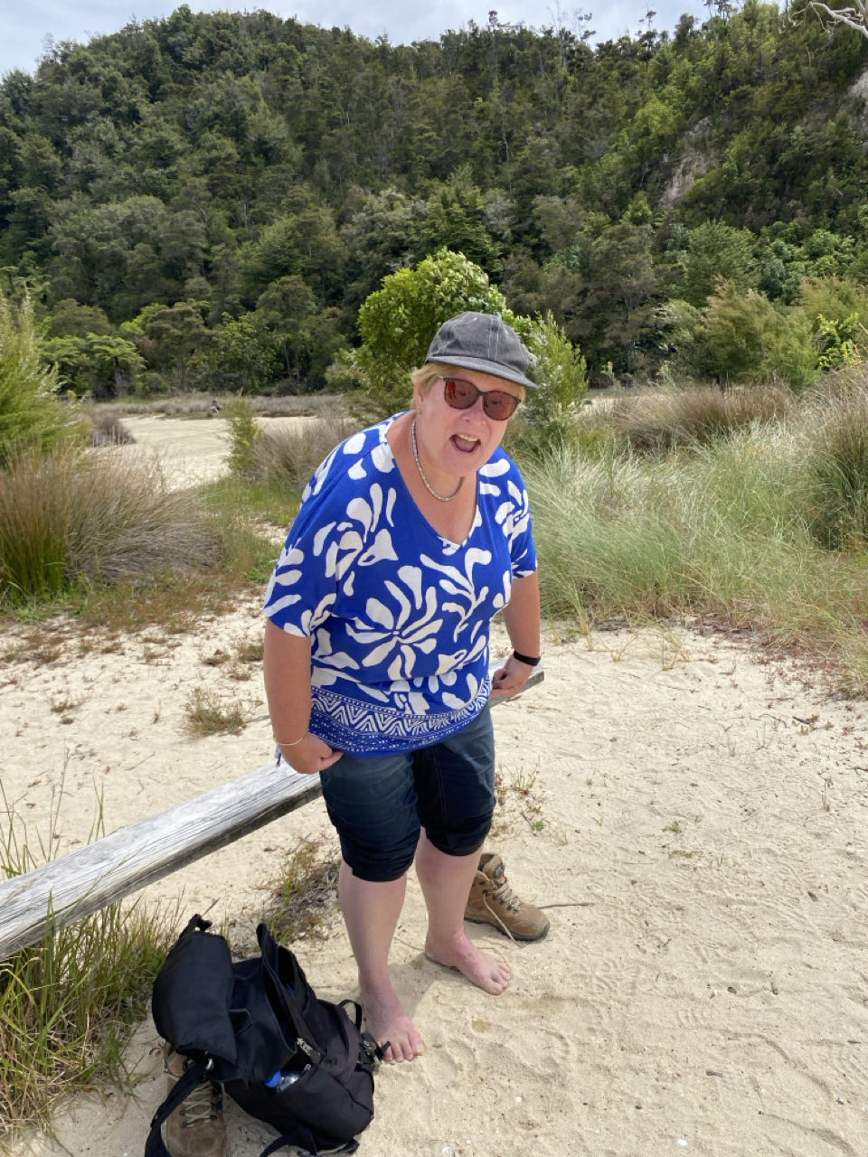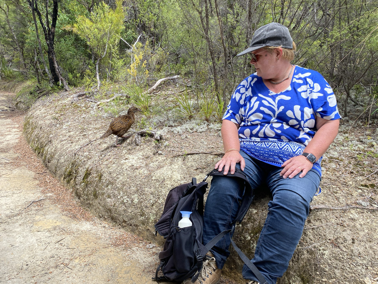 Bij Torrent Bay moeten de schoenen uit. Mijn broekspijpen trek ik op tot aan mijn knieĆ«n, maar dat blijkt niet genoeg. Het water trekt tot aan mijn ondergoed op. Nou ja, het is mooi weer. Het droogt vanzelf. Nu het eb is kunnen we bij Torrent Bay een stuk afsnijden, een soort wadlopen. Af en toe gaan de schoenen uit bij diepere poeltjes. De 15 kilometer lange tocht, een gedeelte van de meerdaagse Abel Tasman-track, met wederom klimmen en steile afdalingen is erg mooi. Bij een van de stops zien we een Weka, een koddig beest. Deze vogel is een loopvogel en kan dus niet vliegen. Hij is vrij nieuwsgierig. Er zouden niet veel Weka's meer zijn maar vandaag zien we er een stuk of vijf. Bij een waterval ligt een kleine blauwe pinguïn dood in het water. Op de video zie je een Weka deze pinguïn weghalen, vlak voor onze neus. Af en toe lijkt het alsof we in de jungle lopen, palmbomen, liaanachtige dingen, varens en diverse vegetatie. Met af en toe dan zicht op mooie baaien met helder blauwgroen water. Het is genieten geblazen. Toch ben ik blij als we de eindstreep gehaald hebben. Het klimmen en dalen is best vermoeiend geweest.