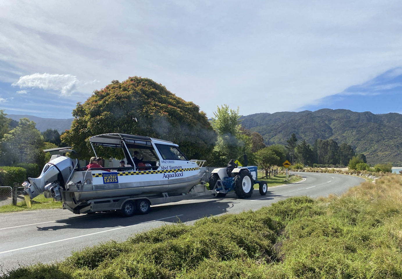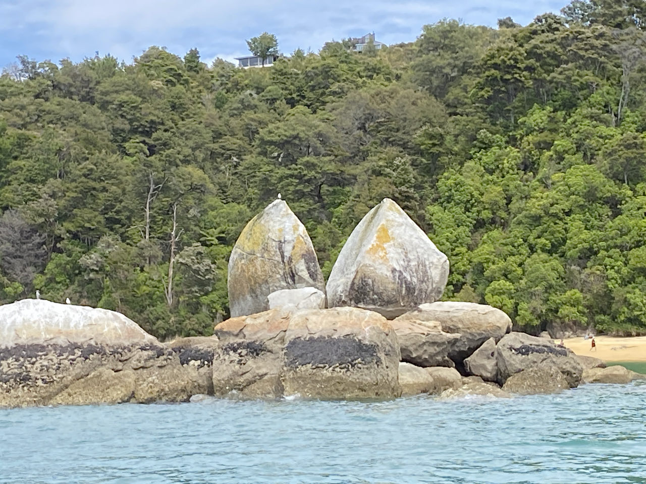 De watertaxi zal ons vandaag bij Torrent Bay afzetten, vanwaar we terug naar huis zullen lopen. Bij het watertaxibedrijf stappen we in een boot op een trailer met een trekker ervoor. Beetje ridicuul gezicht, al die boten met mensen op de rijweg. Maar het is eb, de trekker rijdt wel 150 meter het strand op voordat er voldoende water is. De taxi moet ook elders mensen ophalen, dus pikken we als extraatje een bezienswaardigheid mee: Split Apple Rock. De granieten rots lijkt inderdaad op twee appelhelften.
