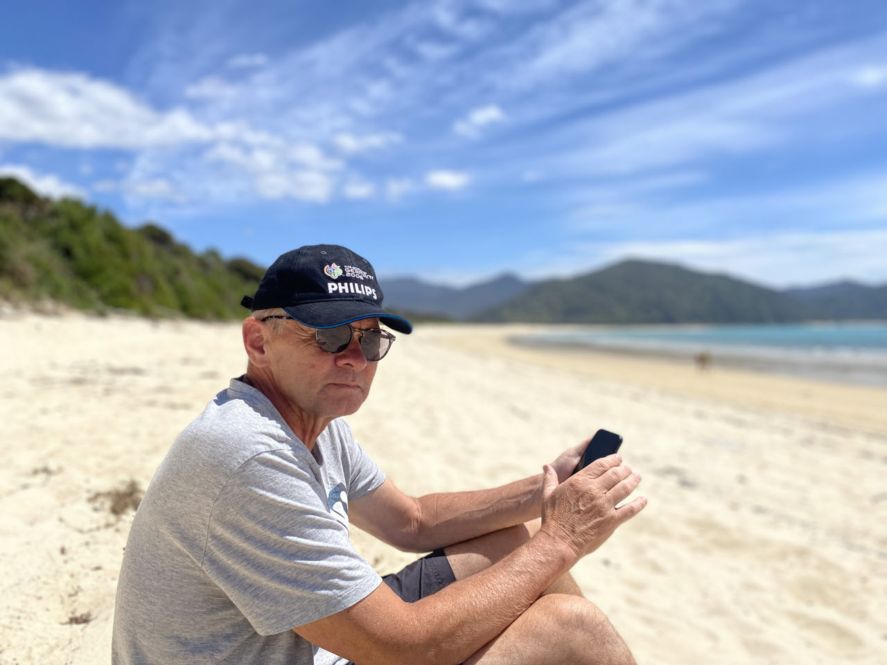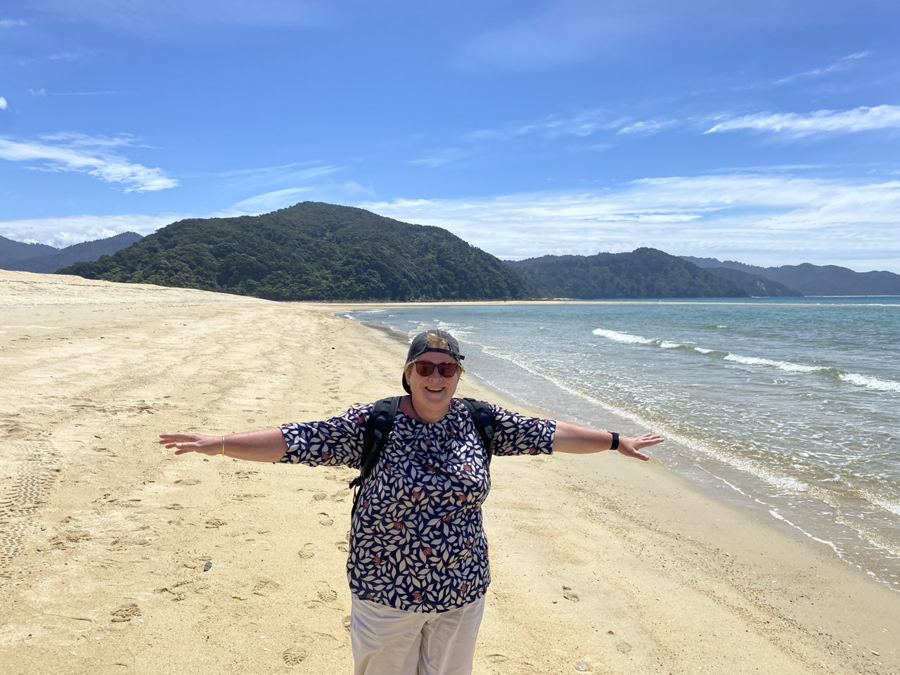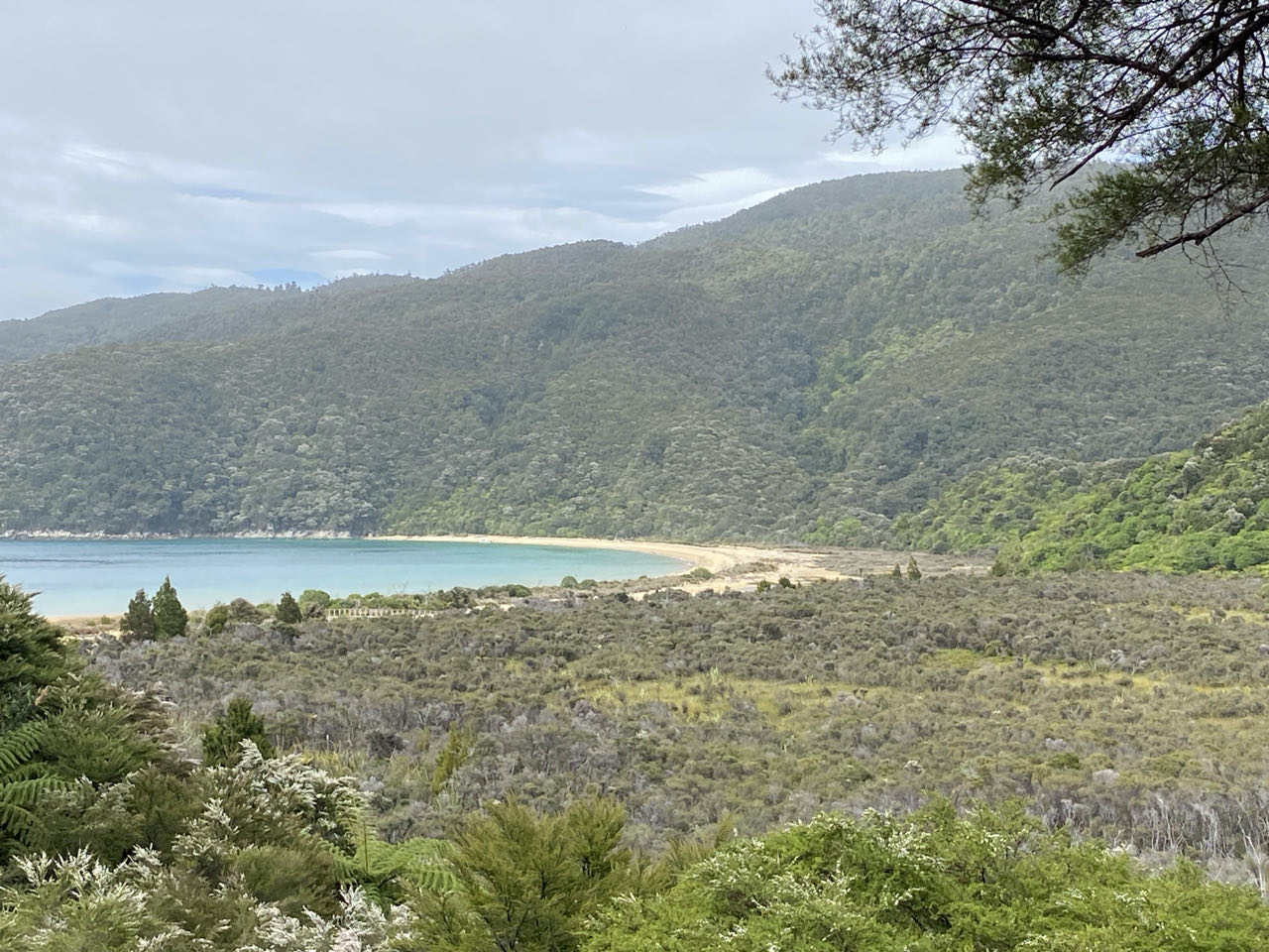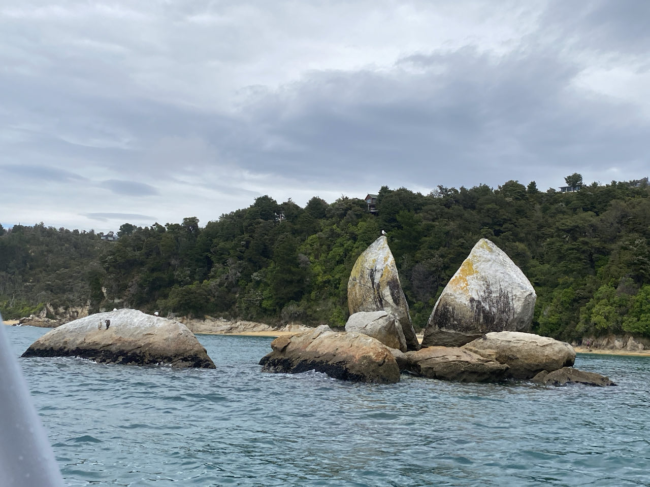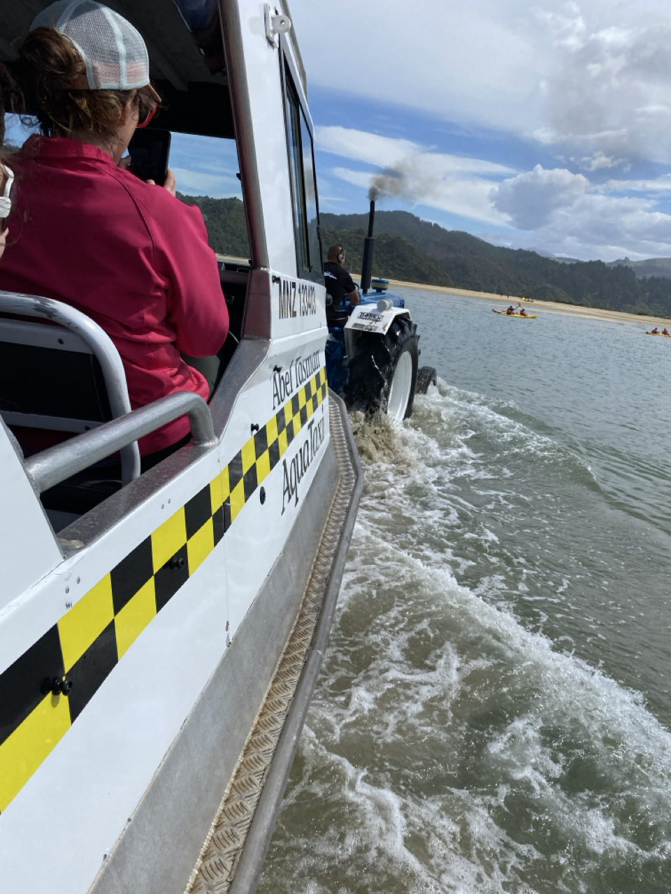 Om kwart voor negen stonden we klaar voor de watertaxi om bij Onetahuti afgezet te worden. Ons huisje ligt bijna naast het bedrijf van de watertaxi’s, erg comfortabel. Bij de wachtenden ontwaren we ook Suzan en Freek. Helaas stapten zij bij een andere bootje in en hebben we ze de rest van de dag niet meer gezien. Wat we wel zagen: opnieuw Split Apple rock en iets later dolfijnen. Er zwommen er wel zo’n vijftig rond de boot. Sommige deden hun kunstje en sprongen op uit het water en schattig was het babydolfijntje dat strak naast zijn moeder bleef zwemmen. Helaas heb ik dat niet vastgelegd op camera. Daarna gingen we aan de wandel in de mooie omgeving om al snel uit te komen bij Awaroa Lodge voor de lunch. Vervolgens hebben we langs het prachtige strand van Awaroa gelopen totdat de watertaxi ons weer op kwam halen. Om in de boot te komen moesten schoenen en sokken uit, de opgetrokken broek werd toch weer nat en vervolgens een dik uur varen terug naar Mārahau. Geen straf, want wat is het er prachtig.