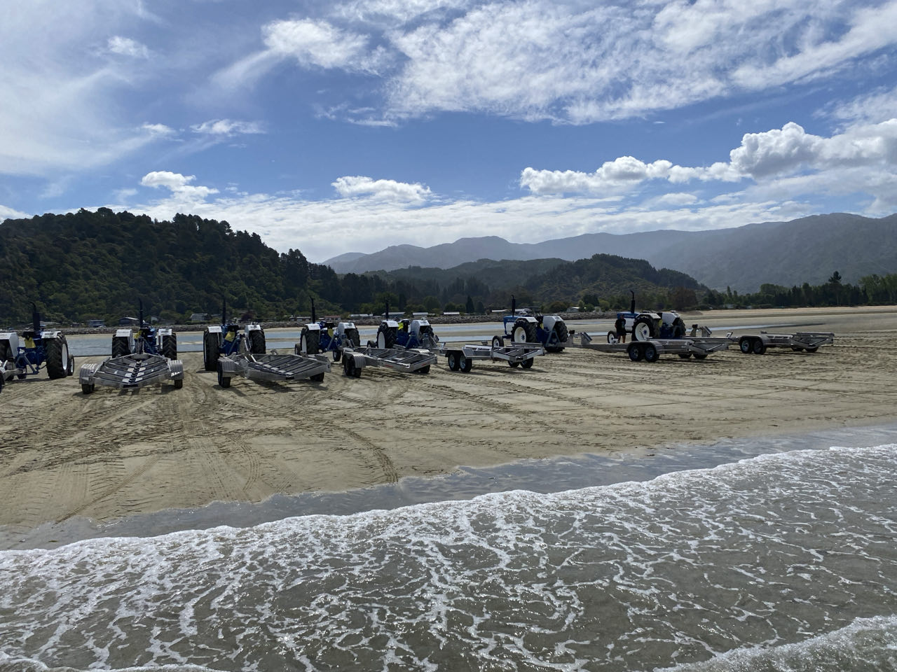 Inmiddels was het daar eb, dus stonden de trekkers alweer klaar om ons vanaf het strand de zee uit te trekken.