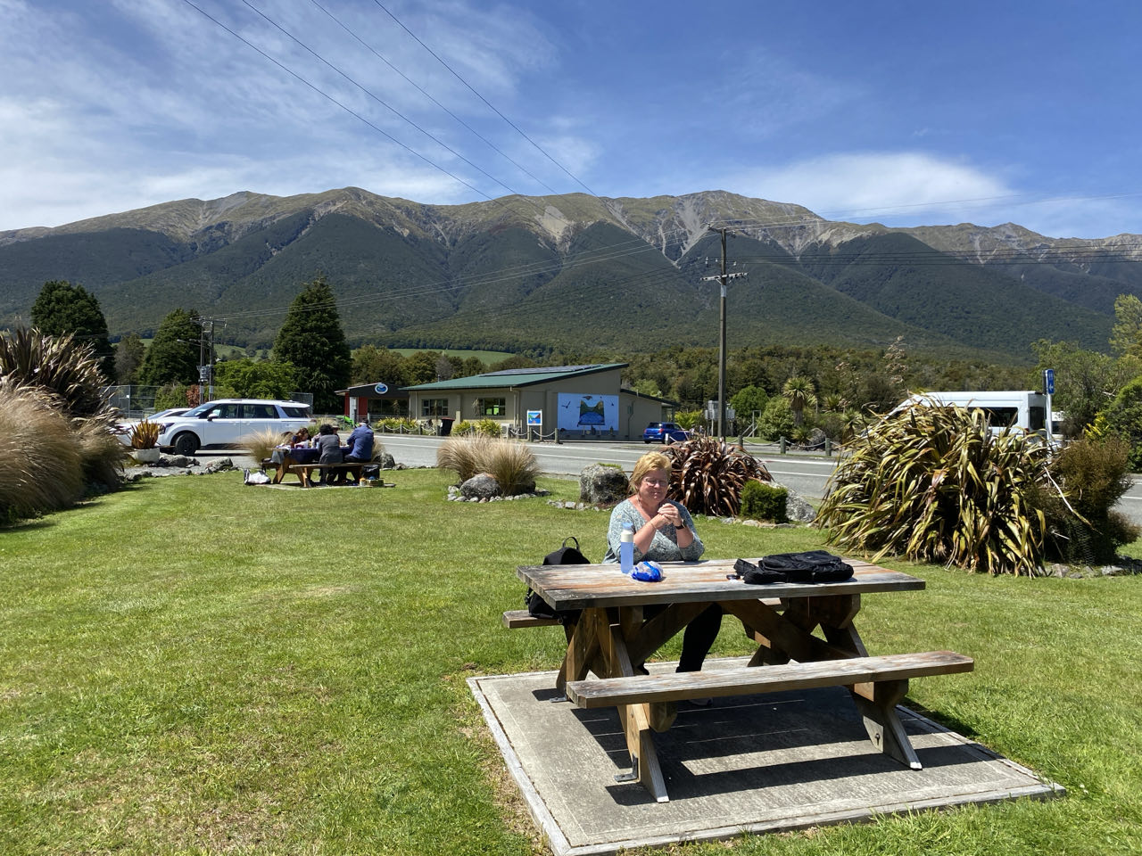 Onderweg moeten we een andere route rijden vanwege een wegopbreking. Zo komen we langs Nelson Lakes National park waar we kort afbuigen om het Rotoiti-meer te bekijken. Mooi, met enige bergen op de achtergrond, zelfs met wat sneeuw.