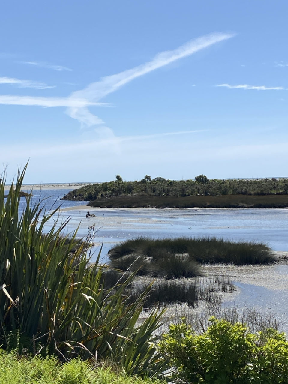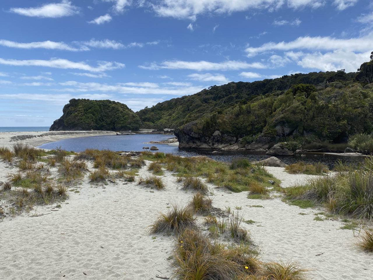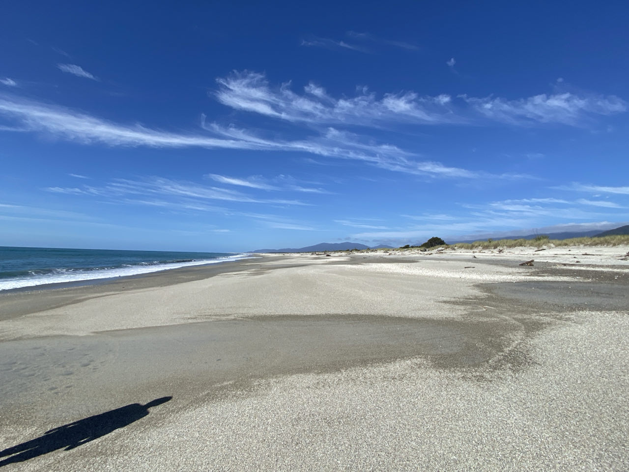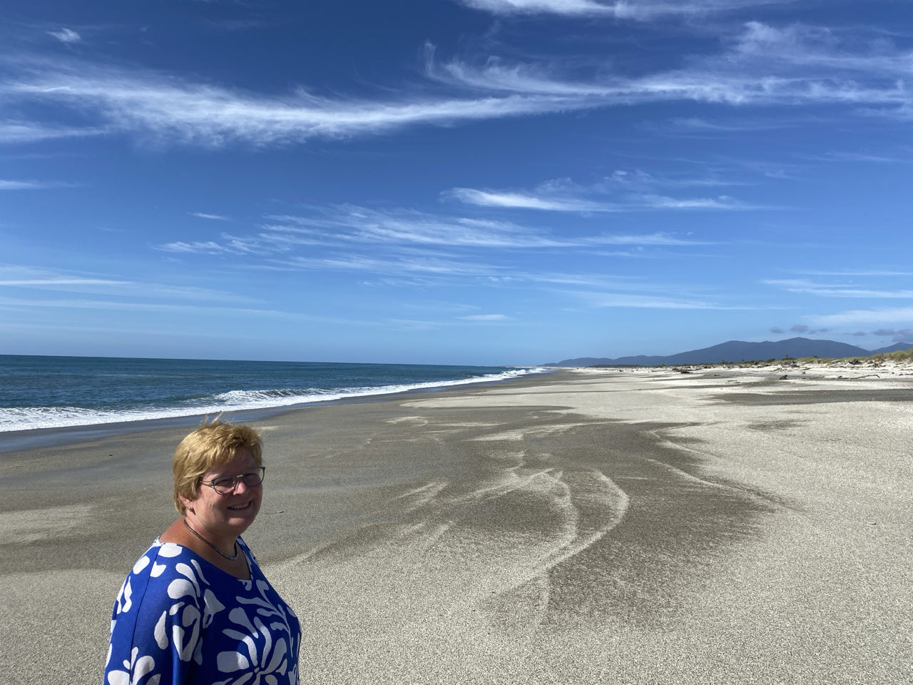 Op weg naar het motel weten we de omgeving in foto's vast te leggen. Dat bijna nieuwe motel ligt overigens in Haast Beach, wat bestaat uit alleen het motel. Het is 300 meter naar het strand. Peter tekent heel romantisch een hart in het zand met een J en een P. Toch een lichte teleurstelling als blijkt dat het hart er alleen maar ligt om aan te geven dat op die plek het paadje ligt naar het motel. Dat zie je namelijk niet vanaf het strand. Fijn, zo'n praktische echtgenoot, daar kom je mee thuis.