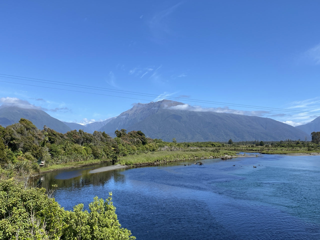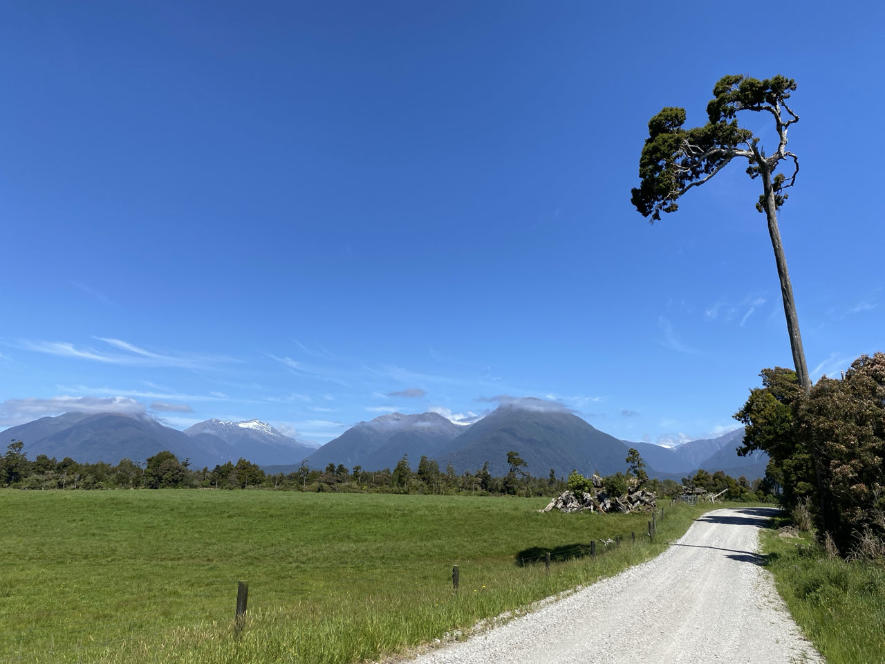 Als we vertrekken uit Franz Josef zien we een bordje: tankstation over 120 kilometer. En dat is precies de plaats waar we uit willen komen, in Haast. Over de enige weg die door het hele gebied loopt. Maar eerst wagen we een laatste poging om iets van een gletsjer te zien. In de plaats Fox Glacier rijden we naar een uitzichtpunt en verhip, een stukje van de gelijknamige gletsjer is zichtbaar. De bovenkant is ook hier in de wolken gehuld.