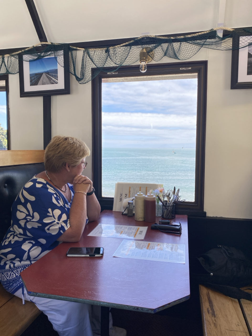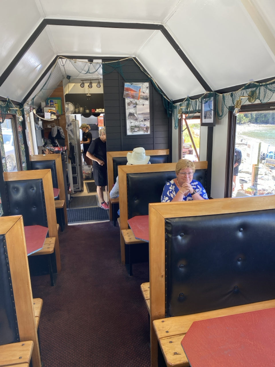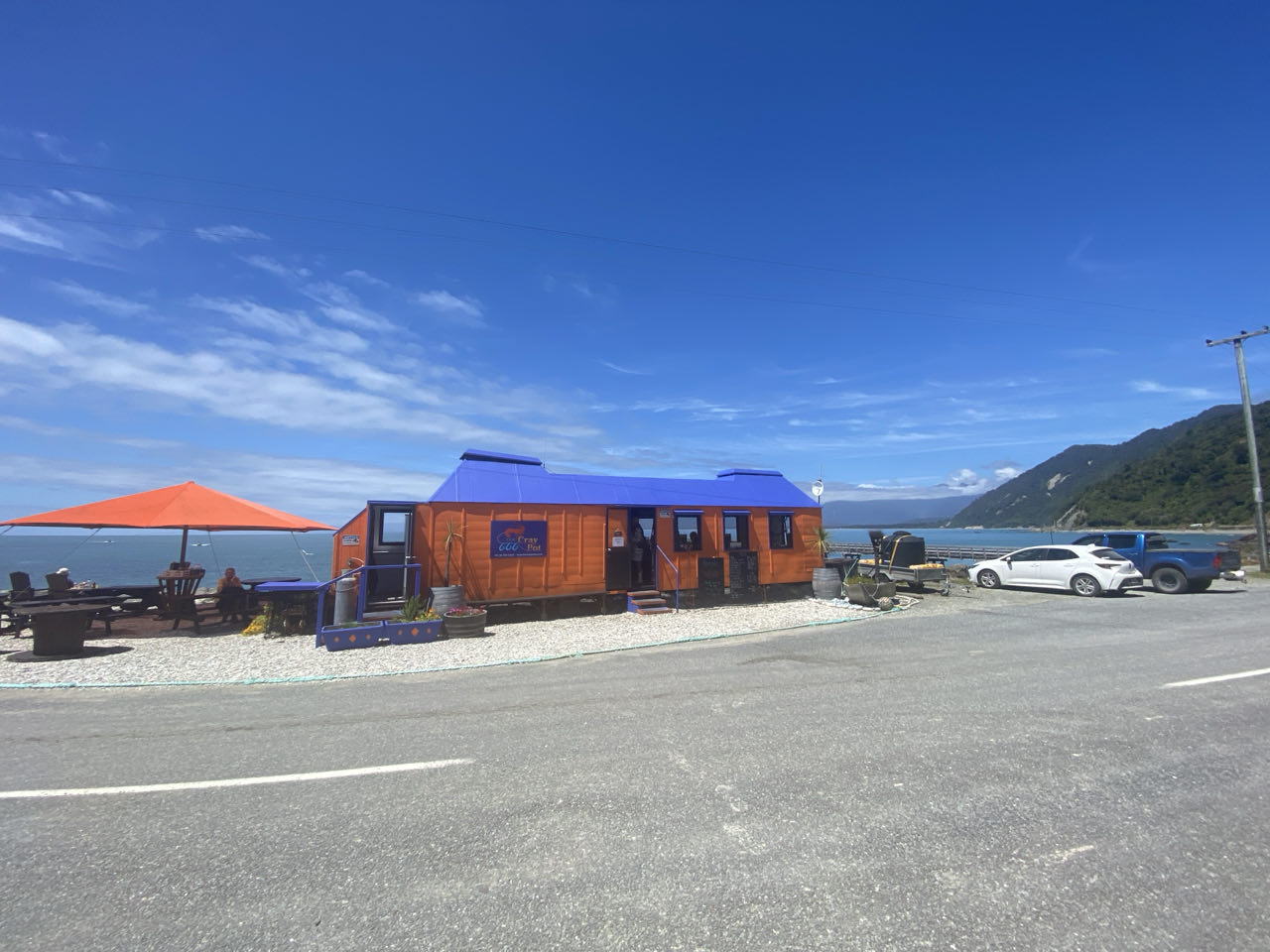 In Haast bezoekt Peter het bezoekerscentrum. Hij vraagt naar leuke wandelingen en de beste plaats om te lunchen. Dat restaurantje ligt 40 kilometer verderop in Jackson Bay. Dus rijden we naar deze oranje en paarse 'wagon'. Voor het eten hoef je niet naar Nieuw-Zeeland maar in de Cray Pot weten ze hoe je vis en super lekkere seafood chowder (soort vissoep) klaar maakt. En dat in een mooie baai met pier en bergen met sneeuw op de toppen in de achtergrond. In de zon zitten we te genieten van het uitzicht.