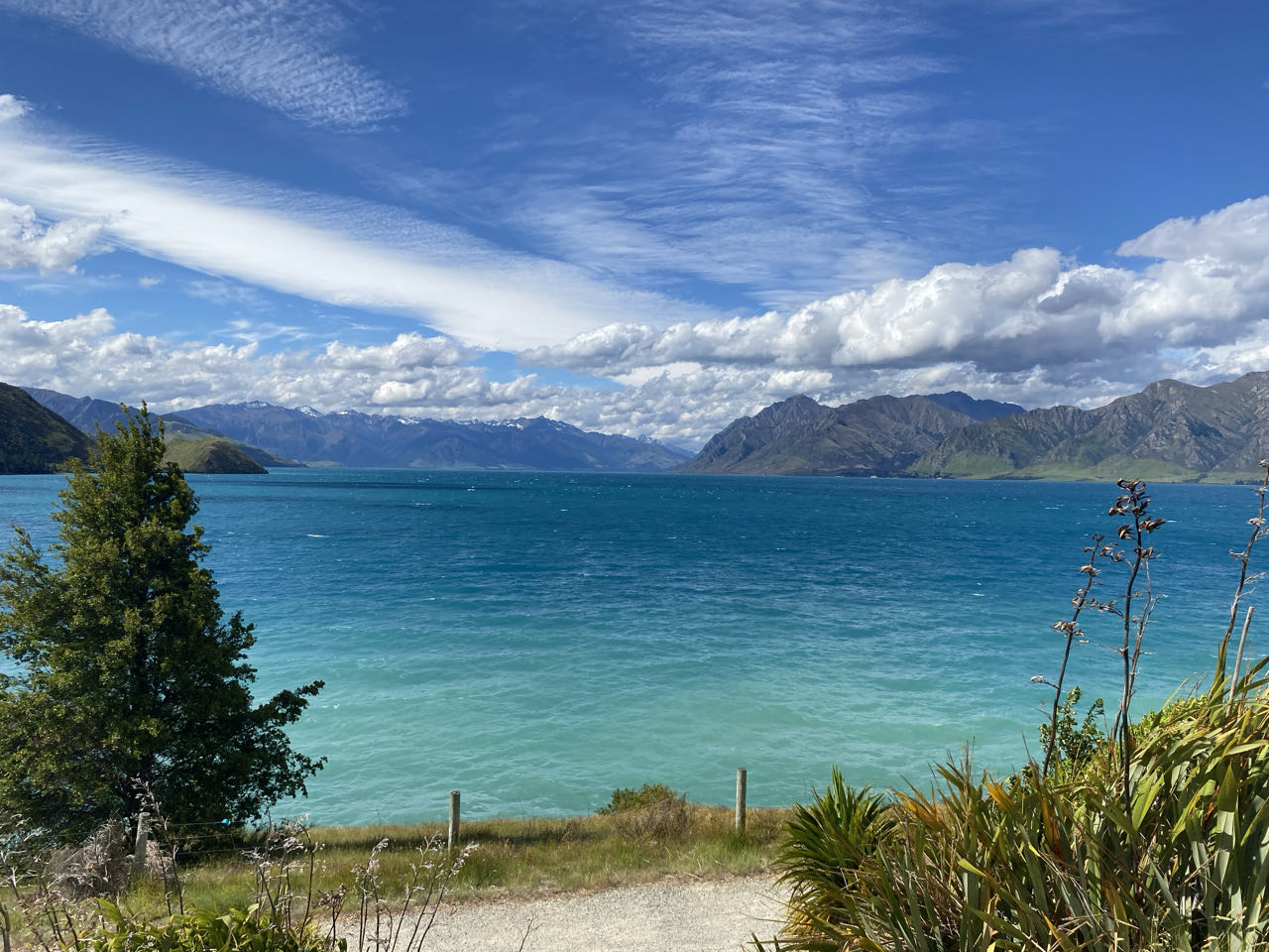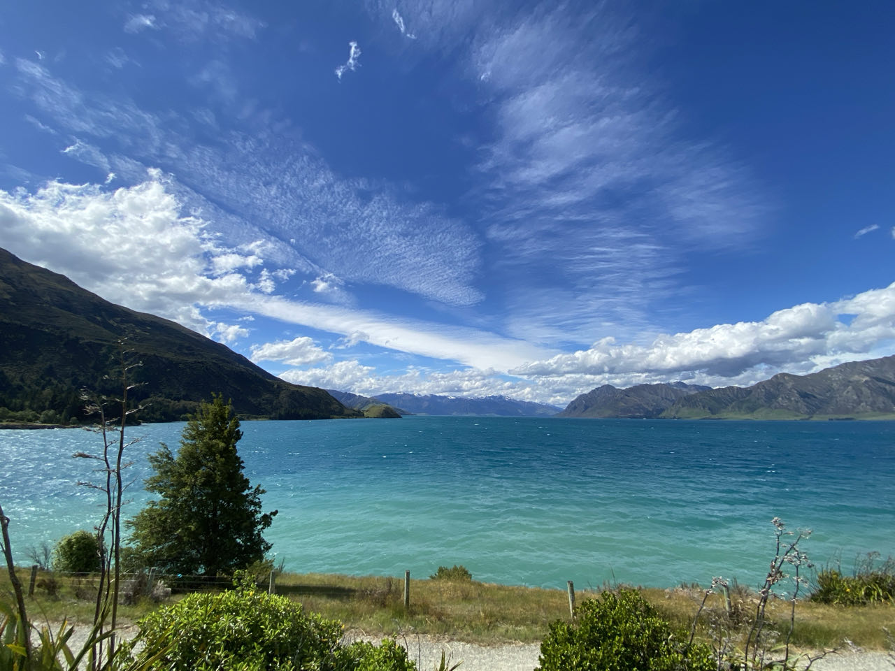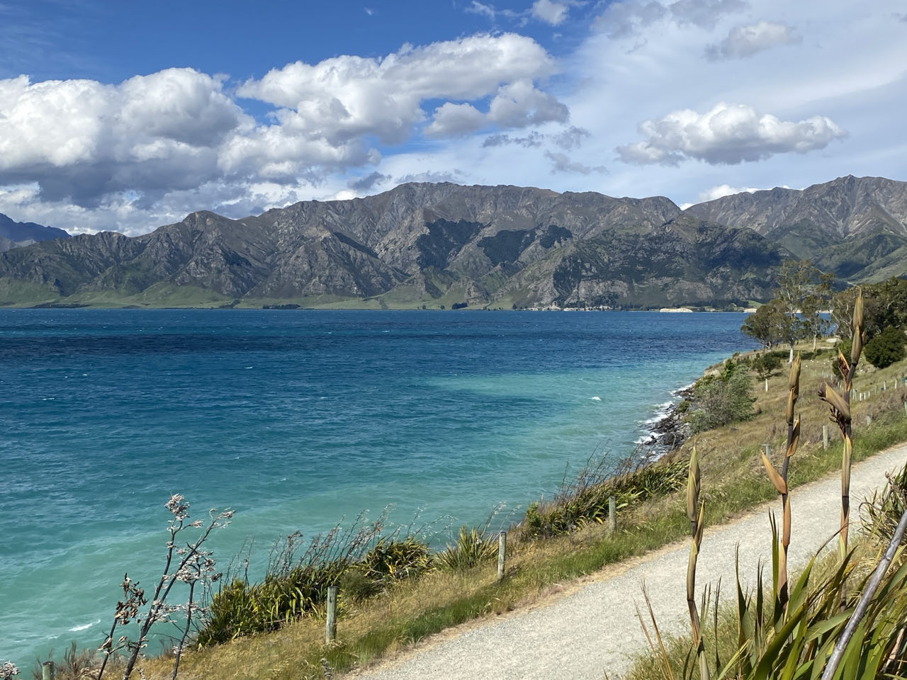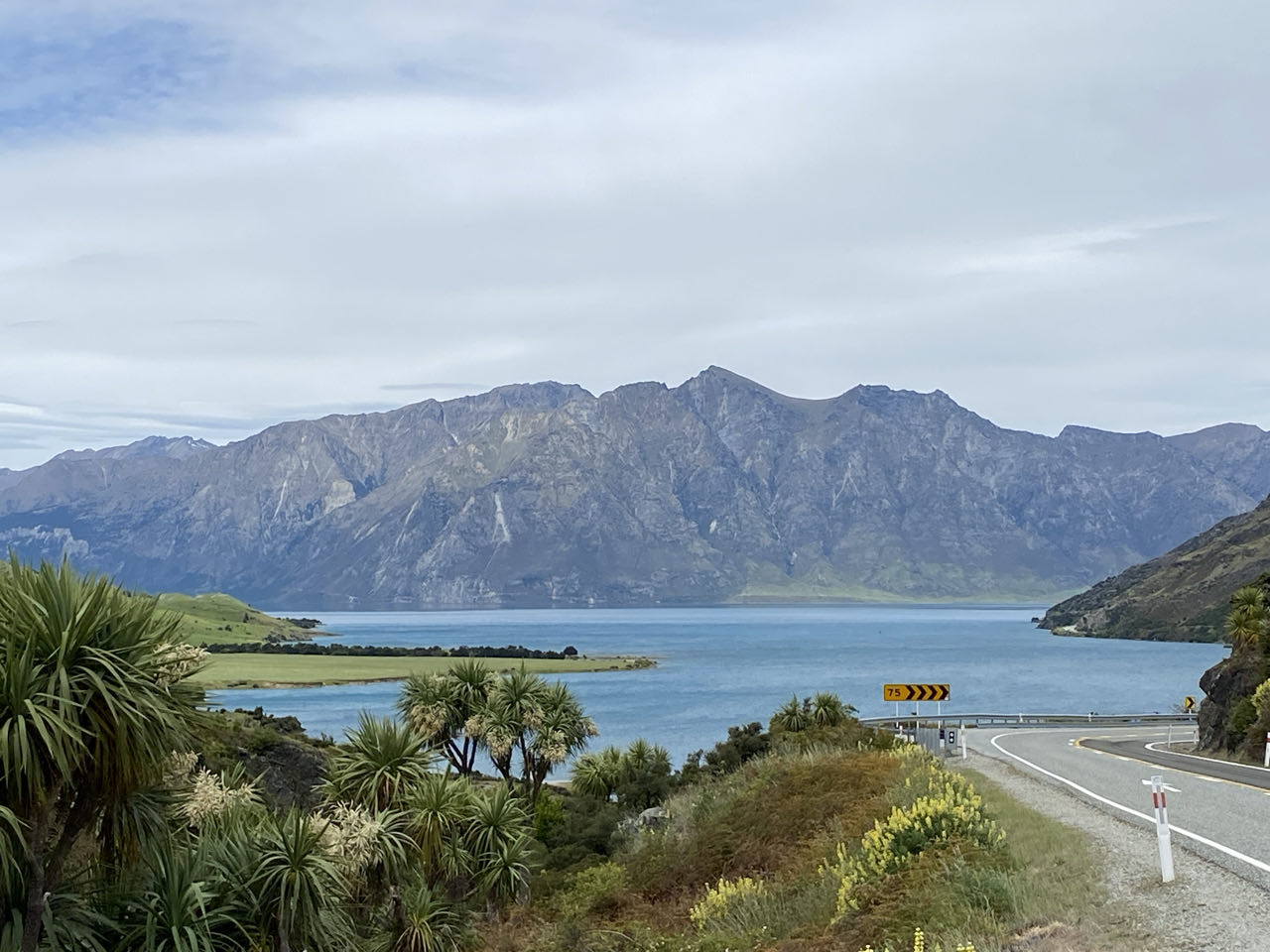 De route leidt ons verder langs Lake Wanaka, erg mooi, daarna maken we een bochtje en rijden recht af op Lake Hawea. Prachtig!