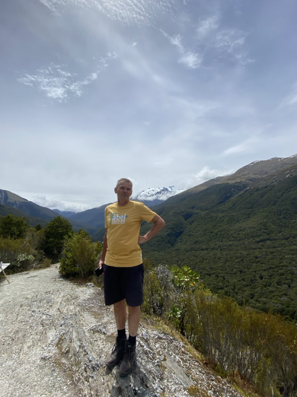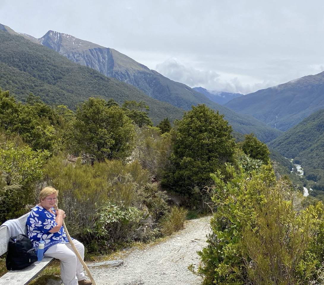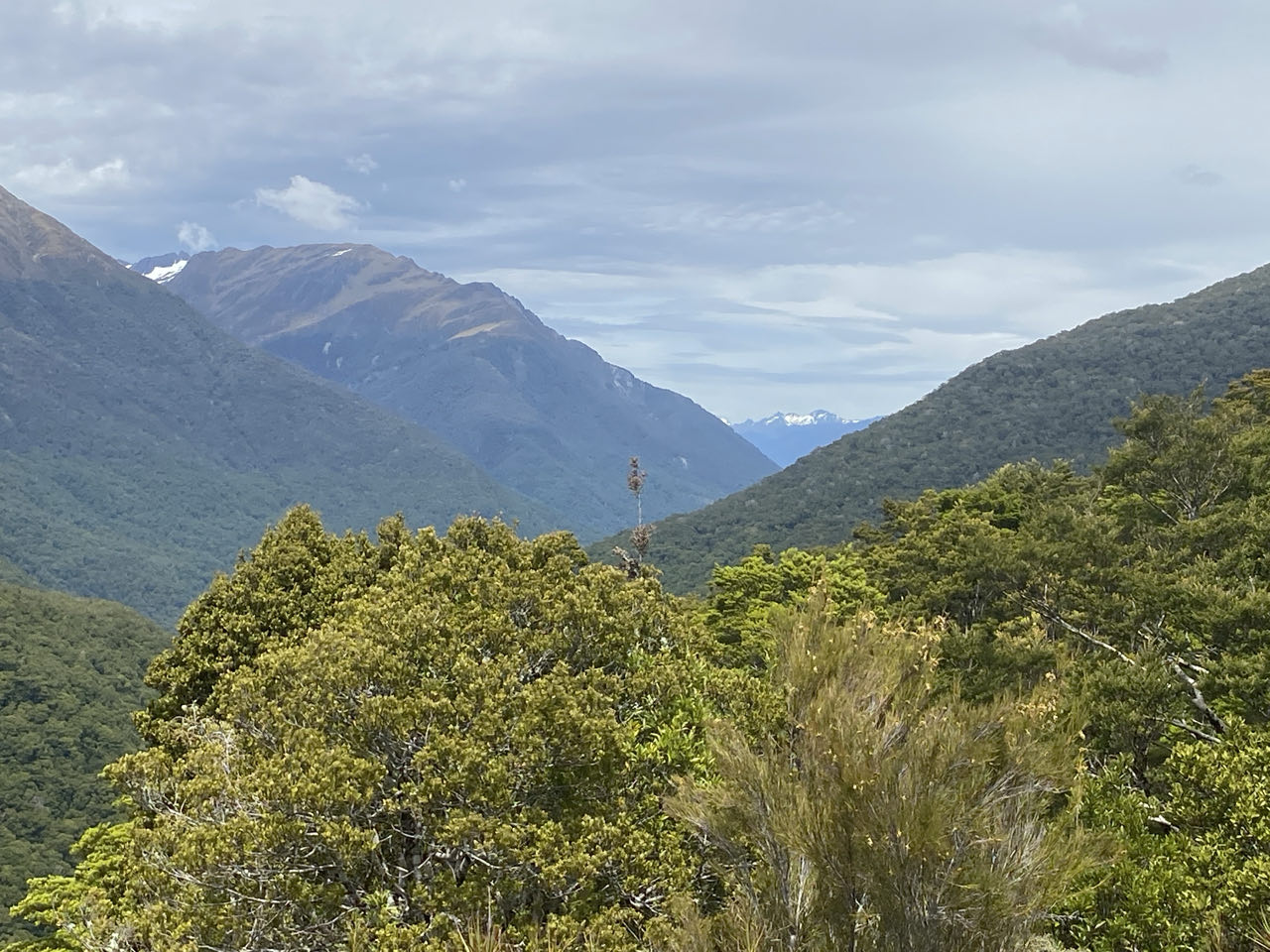 Bij de Haast pass klimmen we omhoog. Vaak zien we mensen met één of twee stokken naar boven klimmen. Peter heeft op het strand van Haast een mooie stok uitgezocht. Die probeer ik hier uit. Op de top hebben we een 360 graden uitzicht op allerlei bergtoppen, sommige met sneeuw.