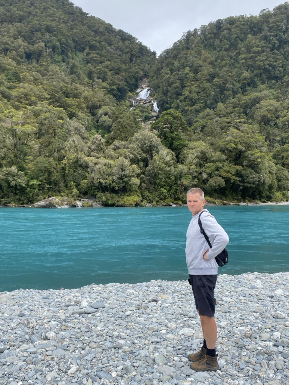 Peter rijdt ons in onze witte Toyota Corolla naar Lake Hawea waar we twee nachten zullen doorbrengen. Highway 6 is zo’n beetje de enige weg in dit gebied en we rijden dus 122 km op deze weg, tot het punt dat we afslaan op de plaats van bestemming. Onderweg stoppen we achtereenvolgens voor een wandeling naar waterval Roaring Billy. Mooier vinden we nog de brede rivierbedding bezaaid met de fraaiste kiezels en rivierwater van het mooiste blauw.